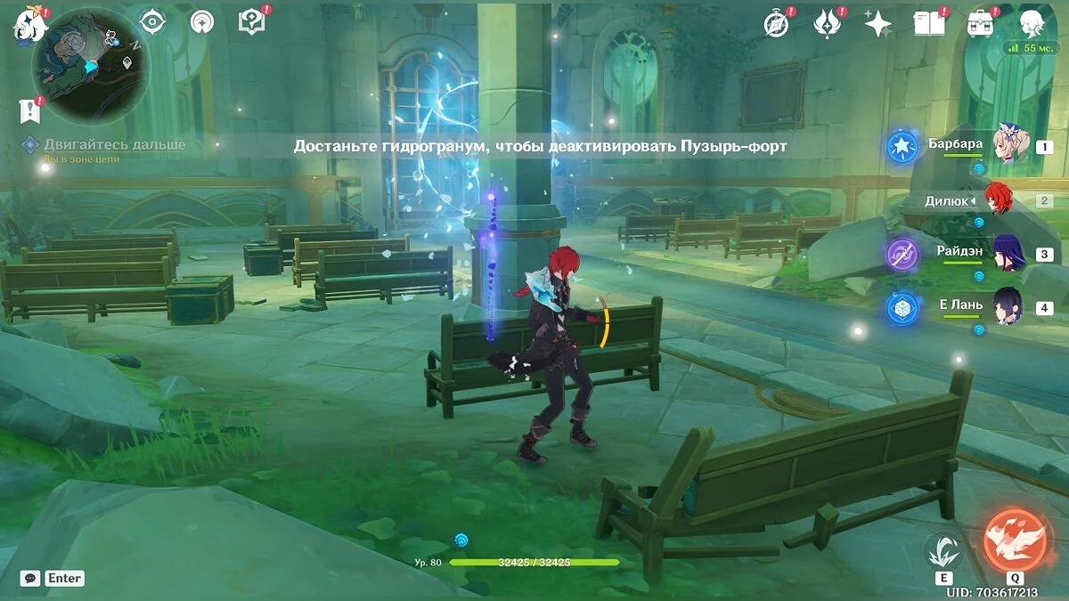 Бегите в открывшийся проход и садитесь в лифт, затем осмотрите богатый сундук. Так вы окажетесь в просторной комнате с книгами. Паймон предположит, что это библиотека. Здесь же начнётся катсцена, а дверь, из которой вы пришли, закроется. В этой комнате есть несколько гидрогранумов, с помощью которых можно активировать и снова пробежать по ранее изученным локациям.