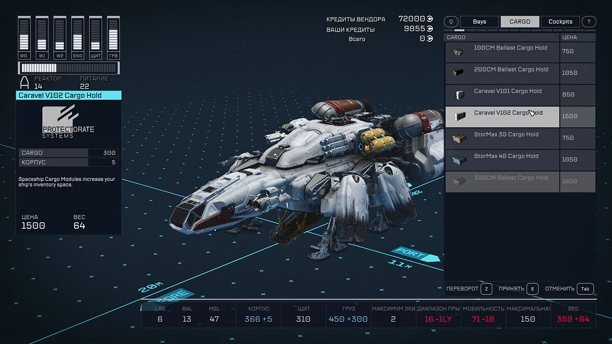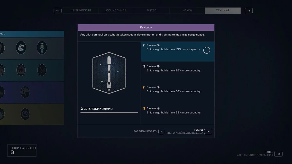 Изначально ваш корабль может вмещать в себя только 450 килограммов предметов. Увеличить этот показатель можно двумя способами: закинув очко навыка в способность «Полезная нагрузка» (Payloads) или купив (улучшив) элементы корабля из категории «Груз» в меню кораблестроения.