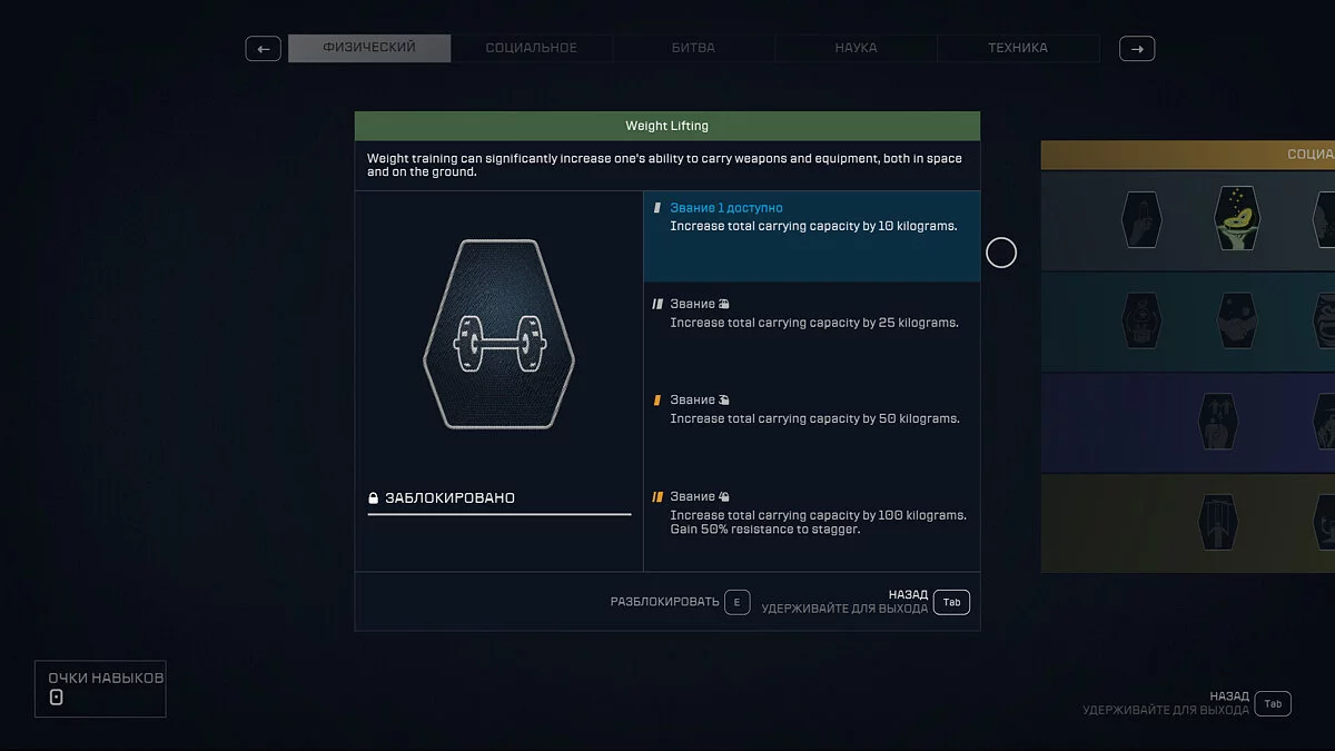 Самое простое решение — добавить очко навыков в способность «Тяжелая атлетика» (Weight Lifting). Она увеличивает максимально переносимый вес на 10/25/50/100 килограмм в зависимости от ранга. Чтобы открыть новые ранги способности, необходимо выполнить испытания: «Пробегите 1000/2500/5000 метров с нагрузкой не менее 75 % от максимальной нагрузки».