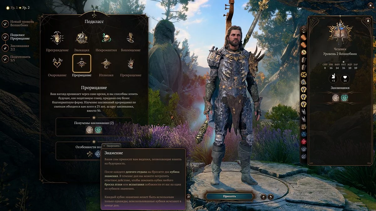 Выбор подкласса — шаг очень ответственный, потому что от этого будет зависеть то, насколько комфортно игрок будет чувствовать себя в любом бою. Как бы вам ни казалось, что «Прорицание» — это что-то несерьёзное, всё совсем не так. Дело в том, что «Прорицание» — это «Знамение», а «Знамение» — самая шулерская вещь в Baldur's Gate 3.