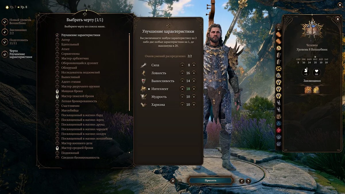 Из доступных черт для волшебника лучше всего выбрать «Улучшение характеристик». Рекомендуем повысить «Интеллект» до 18 единиц (обратите внимание, что повышать характеристики волшебнику нужно строго до чётного значения). От интеллекта напрямую зависит вероятность попадания и сложность спасброска для ваших противников.