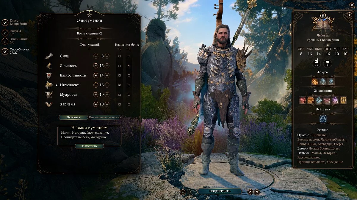 Здесь также станет доступна последняя черта, и мы ещё раз рекомендуем увеличить характеристики. Можно повысить «Телосложение», увеличив таким образом здоровье, «Интеллект» (попадание и спасброски) либо «Ловкость» (КБ). Мы сделали ставку на интеллект, но вы можете экспериментировать и отталкиваться от своего стиля игры.