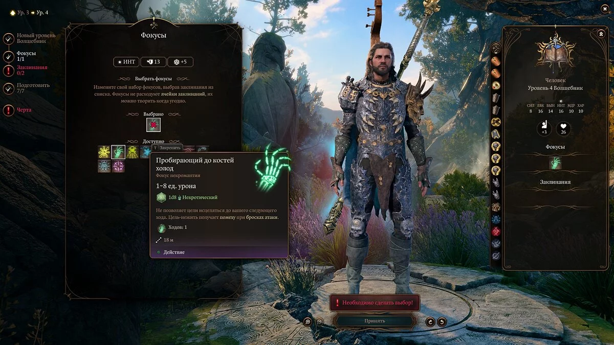Опять появляется возможность выбрать любой фокус, но на данном этапе они не особо нужны. Советуем «Пробирающий до костей холод». Он бывает очень полезен, когда попадает и на несколько ходов лишает врага возможности восстанавливать здоровье.