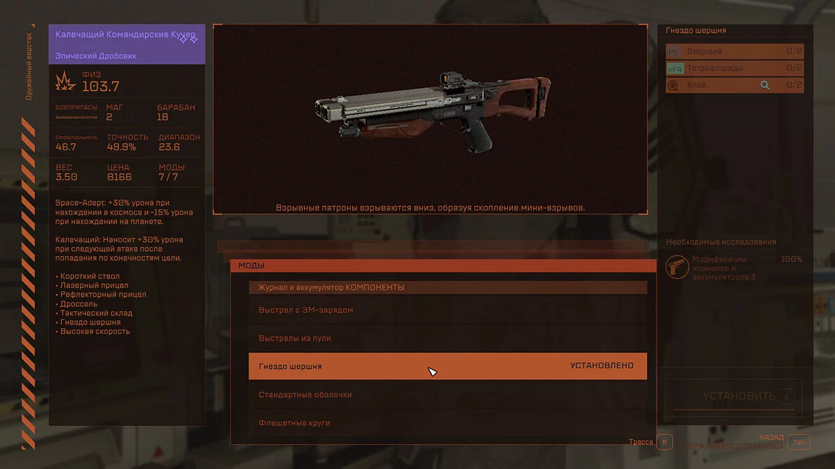 Устанавливая модификации, мы можем как повысить указанные выше параметры, так и добавить выстрелам новые свойства. Например, установка мода «Гнездо шершня» существенно увеличивает урон выстрелов и создает взрыв в месте попадания.