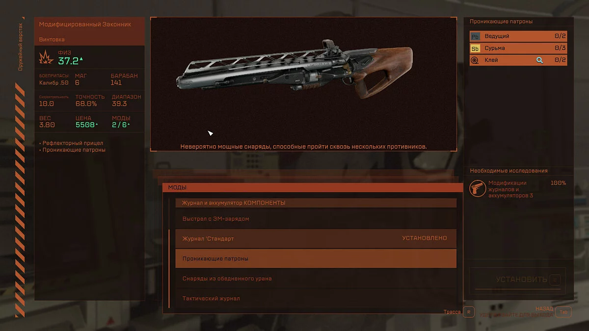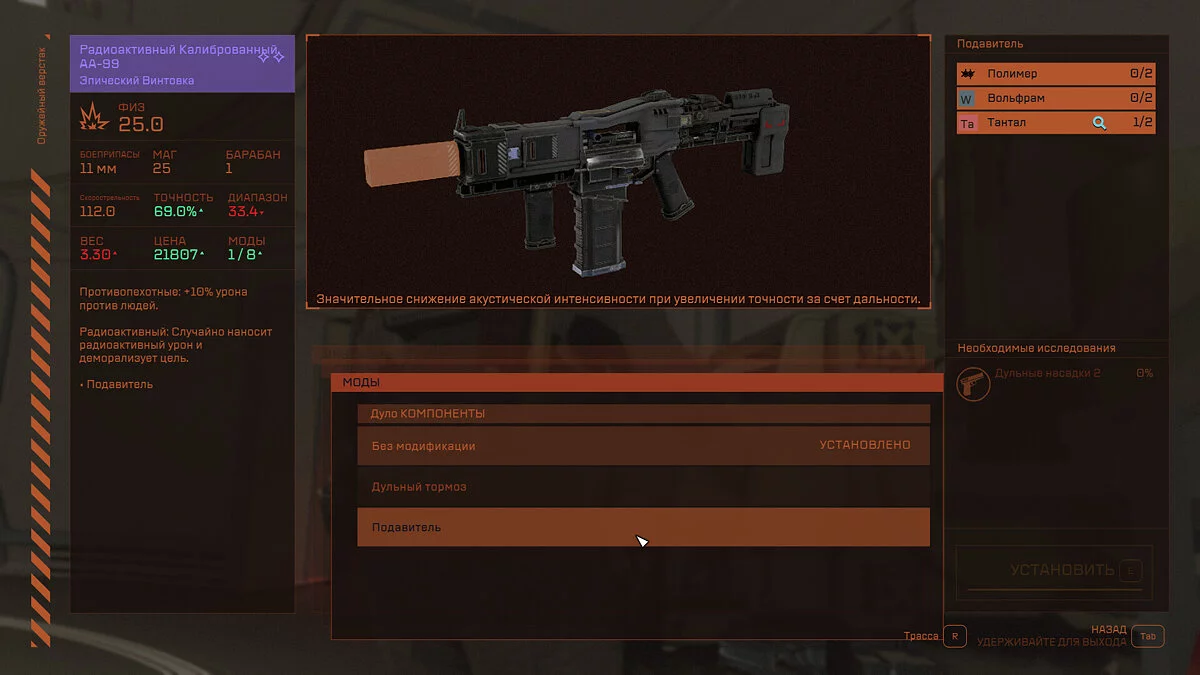 Для того чтобы устанавливать на оружие модификаторы, вам понадобится оружейный верстак, а также очки навыков в способности «Оружейная техника». На стартовом корабле есть станция исследований, а вот оружейный верстак установить туда можно будет далеко не сразу. Вот несколько мест, где вы можете найти оружейный верстак: