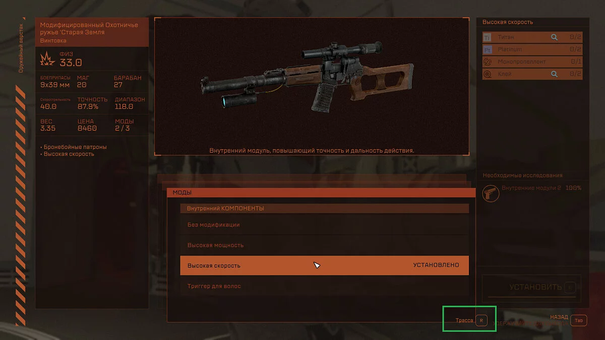 В правой части экрана вы найдете список необходимых предметов и ресурсов, а также в некоторых ситуациях необходимые для установки модификации навыки. Нажмите «R», чтобы отслеживать недостающие ресурсы.
