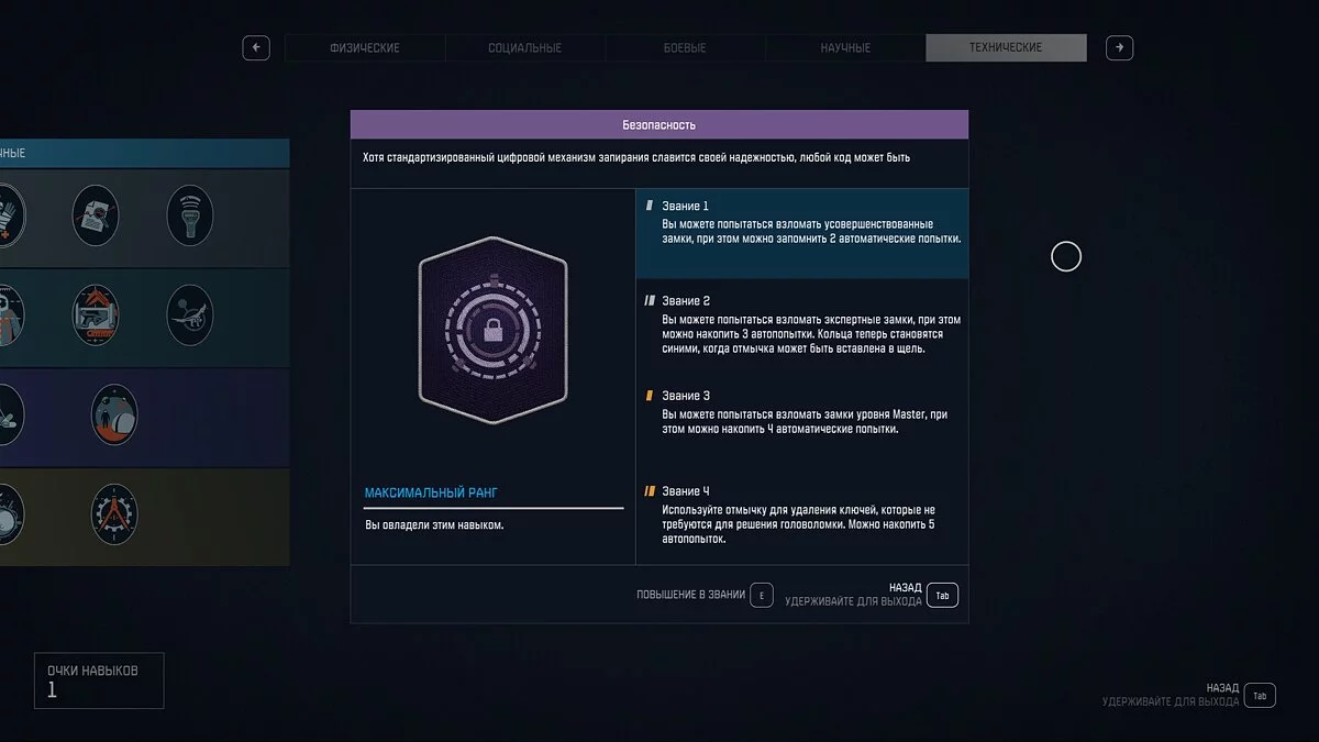 - Безопасность (Security) — вы умеете взламывать продвинутые, экспертные и мастерские замки, также у вас больше «авто-попыток»;
