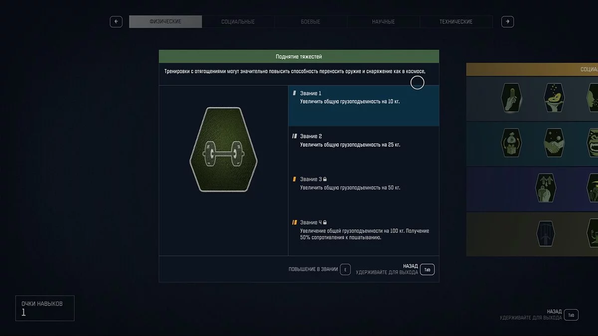 - Гимнастика (Gymnastics) — открывает подкаты, устойчивость при нулевой гравитации, а также высоту прыжков;