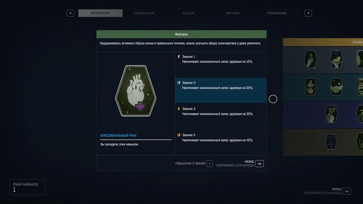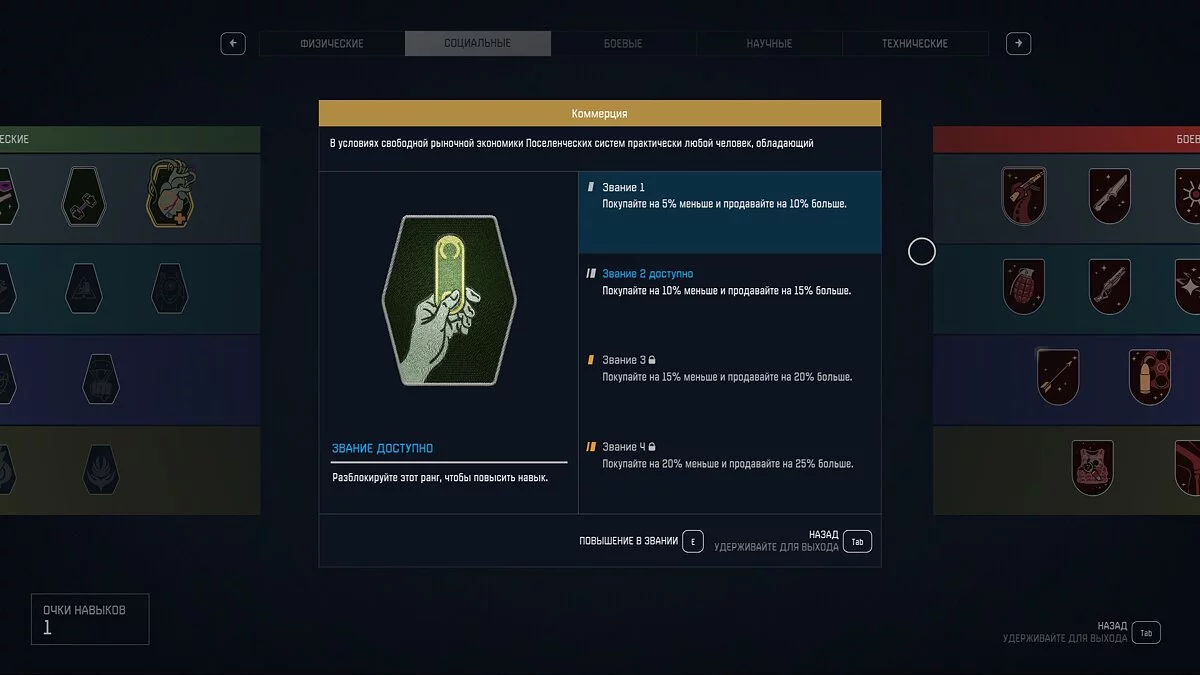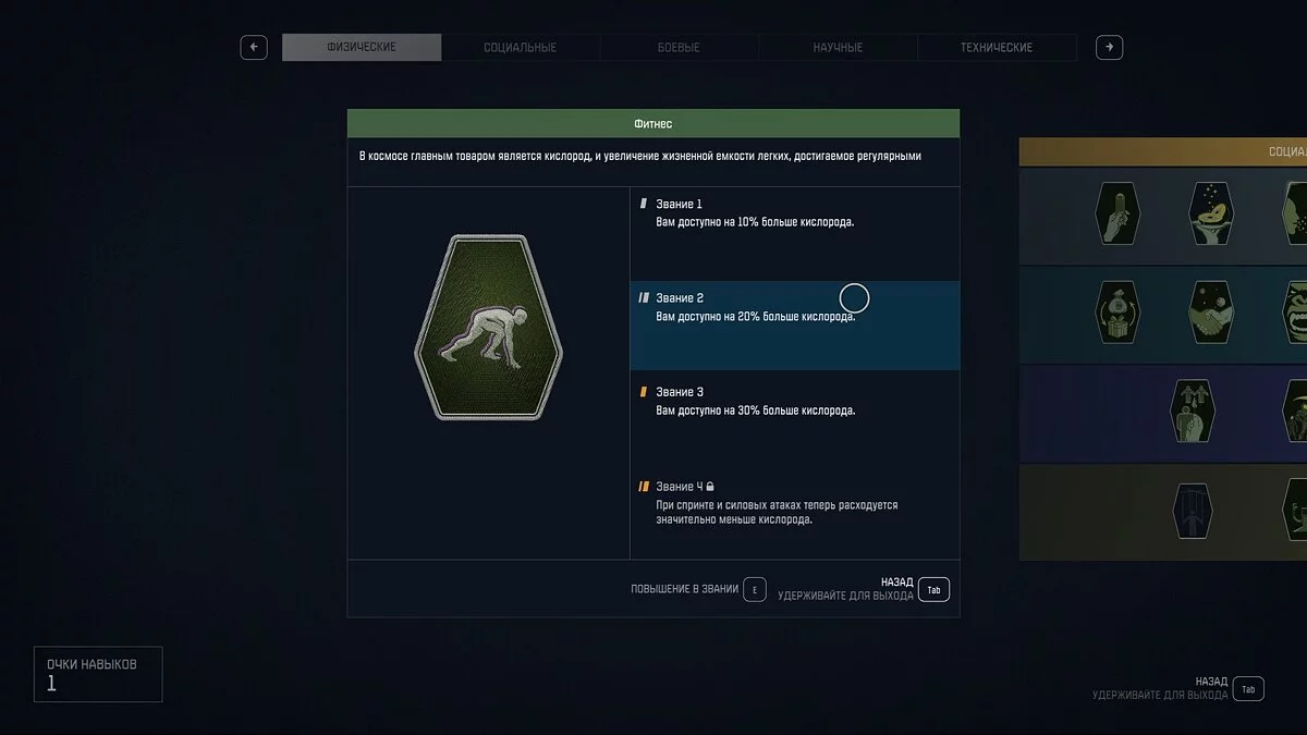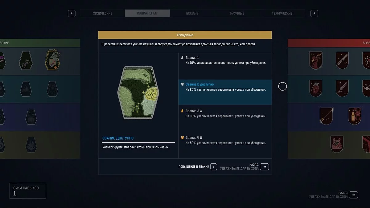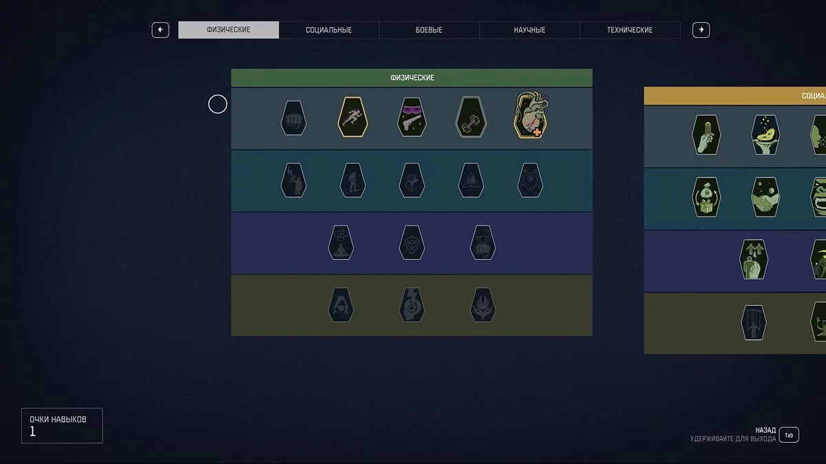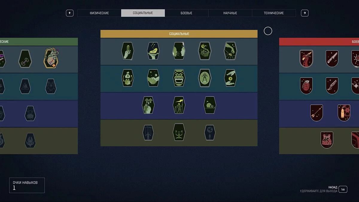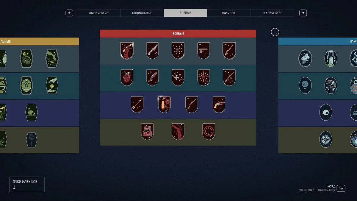 Всего в игре 5 веток прокачки, которые объединяют в себе 82 скилла: физические, социальные, боевые, научные и технические. В каждой ветви 4 уровня, открывающиеся по мере того, как вы вкладываете очки в конкретный путь развития.