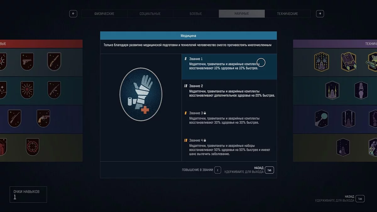 - Медицина (Medicine) — аптечки становятся эффективнее, а после прокачки могут и исцелить недуг;