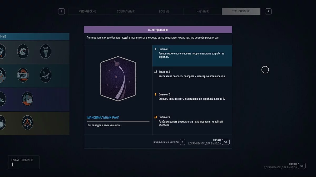 - Пилотирование (Piloting) — вы откроете маневренные двигатели для корабля. На более высоких уровнях вы получите возможность управлять кораблями класса В и С;