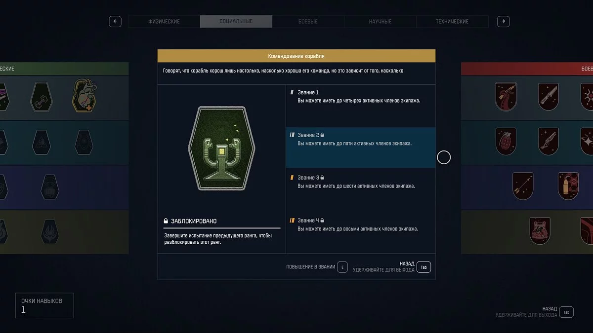 «Командир корабля» — способность, которая поможет укомплектовать ваш звездолет. На высоких уровнях вы можете столкнуться с проблемой, когда больше людей взять к себе уже невозможно. Перк решает эту задачу. Чем больше народа отвечает за различные системы судна, тем эффективнее вы ведете себя в космосе.