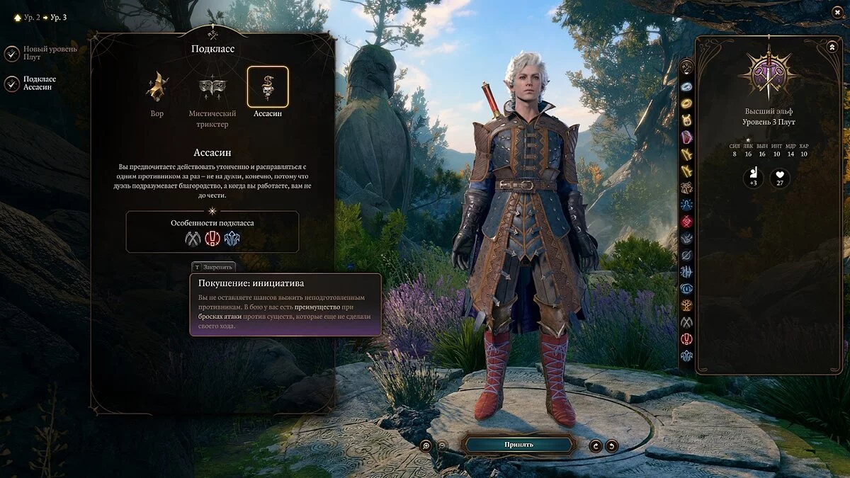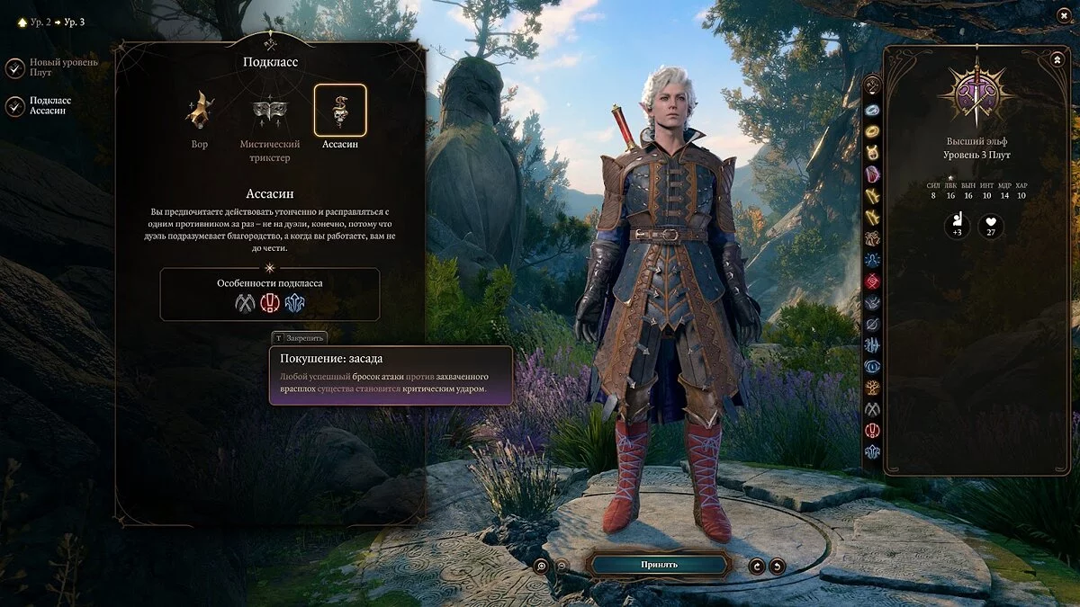 Мы пропускаем некоторые уровни, поскольку там от вас ничего не требуется, кроме как нажать кнопку «Принять». Если вы хотите, чтобы условный Астарион приносил максимальную пользу, на третьем уровне выберите «Ассасина». Этот подкласс будет давать вам огромное преимущество в бою — куда большее, чем дополнительное бонусное действие «Вора» или заклинания «Магического трикстера». Один критический удар может нанести урон куда выше, чем несколько обычных атак.