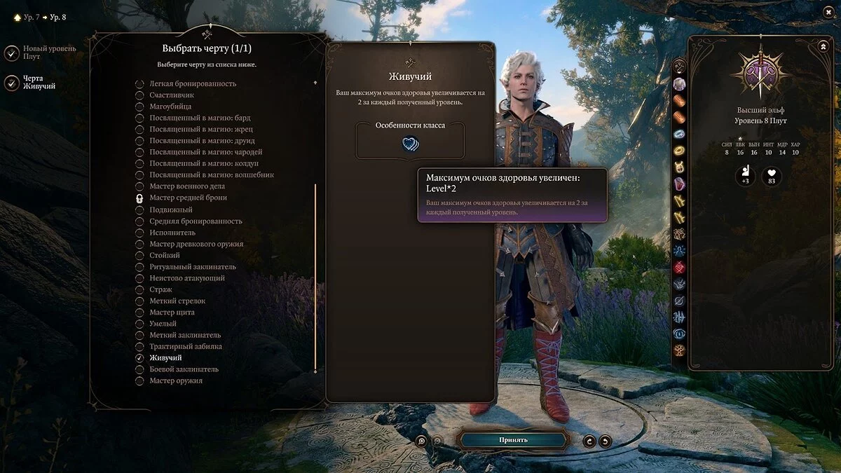 «Живучий» — одна из самых лучших черт для плута, потому что даёт огромное преимущество перед противниками: теперь им нужно приложить немало усилий, чтобы вас убить. Удвоенные HP нужны как минимум для того, чтобы чувствовать себя увереннее и компенсировать «Выносливость», которую мы больше увеличивать не будем. Так как плут — это зачастую боец ближнего боя, побольше здоровья ему не помешает.