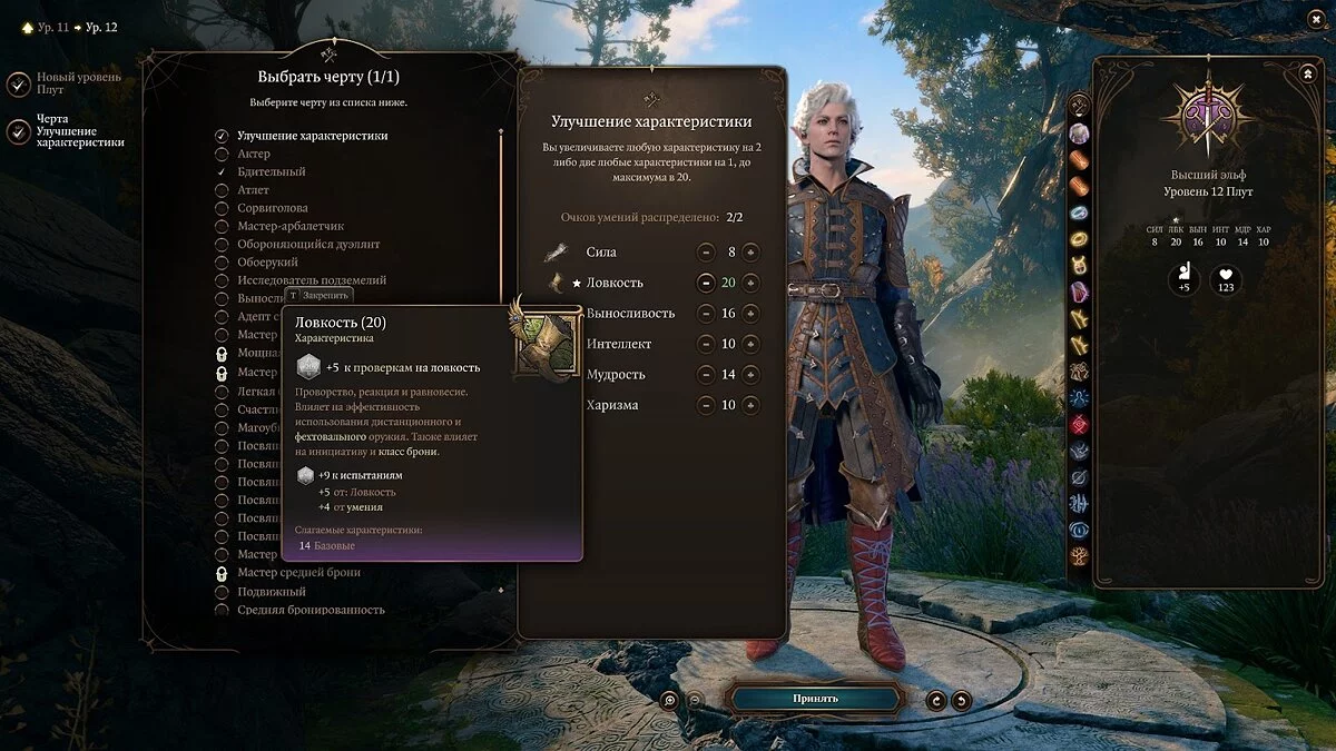 На десятом и двенадцатом уровнях мы рекомендуем вам увеличить «Ловкость» через «Увеличение характеристик». Желательно повысить данный показатель до 20 единиц. Вы увеличите не только свой урон, но ещё и «Класс брони» (КБ), «Инициативу» (окончательно не оставив врагу возможности походить первым), и в целом поднимете до максимума модификаторы навыков, на которых основан геймплей плута.