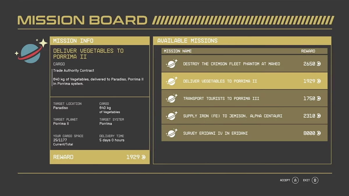 На досках объявлений, где размещены дополнительные поручения, можно брать контракты по доставке товаров из одной точки в другую. Это немного нудный, но самый безопасный способ заработка, поэтому он подойдёт для тех, кто ещё не прокачал персонажа и не получил первоклассное вооружение для космического корабля. Или вы можете заняться перевозкой грузов, если устали от других активностей в игре.
