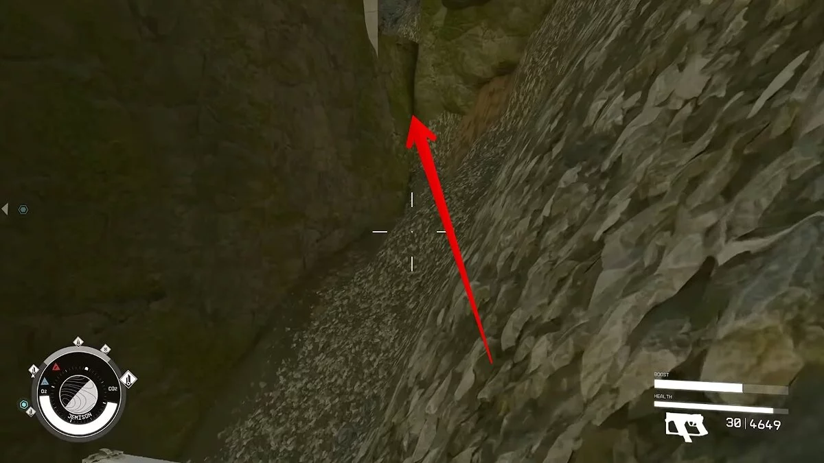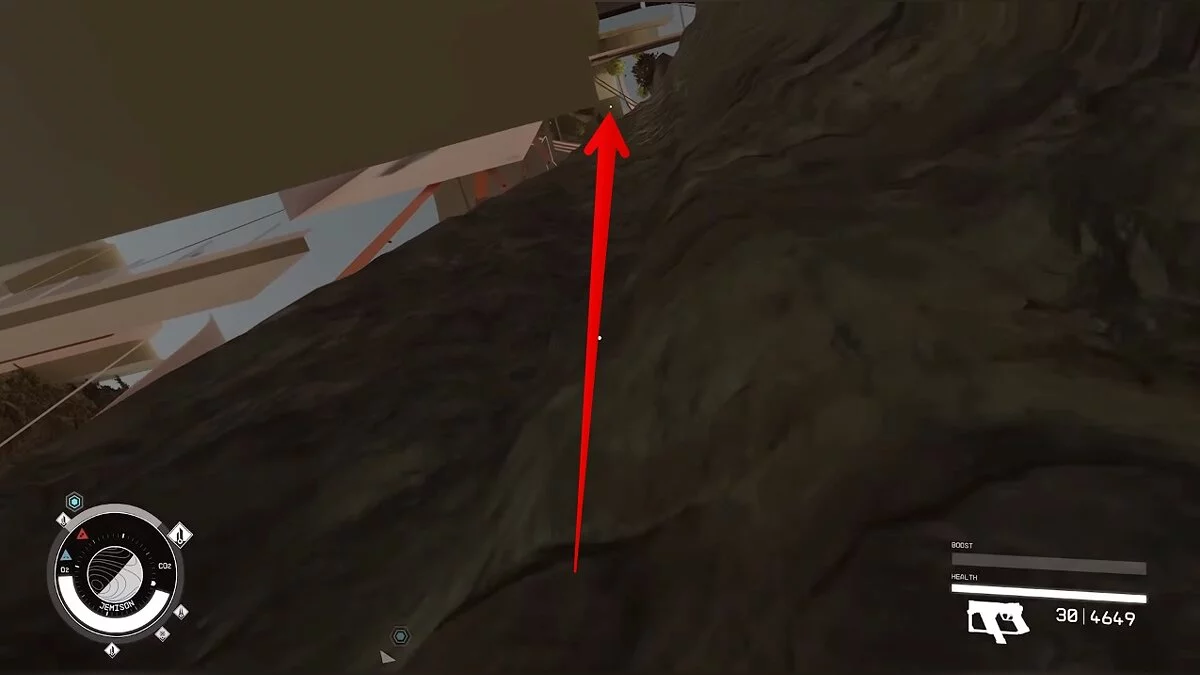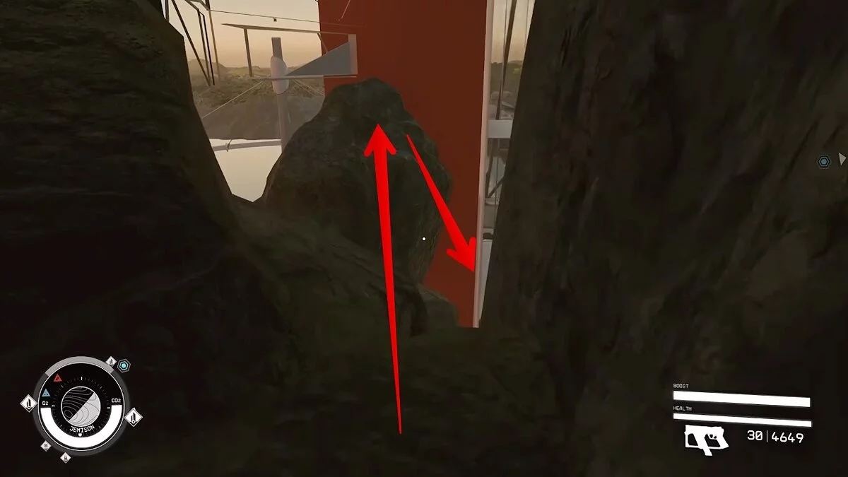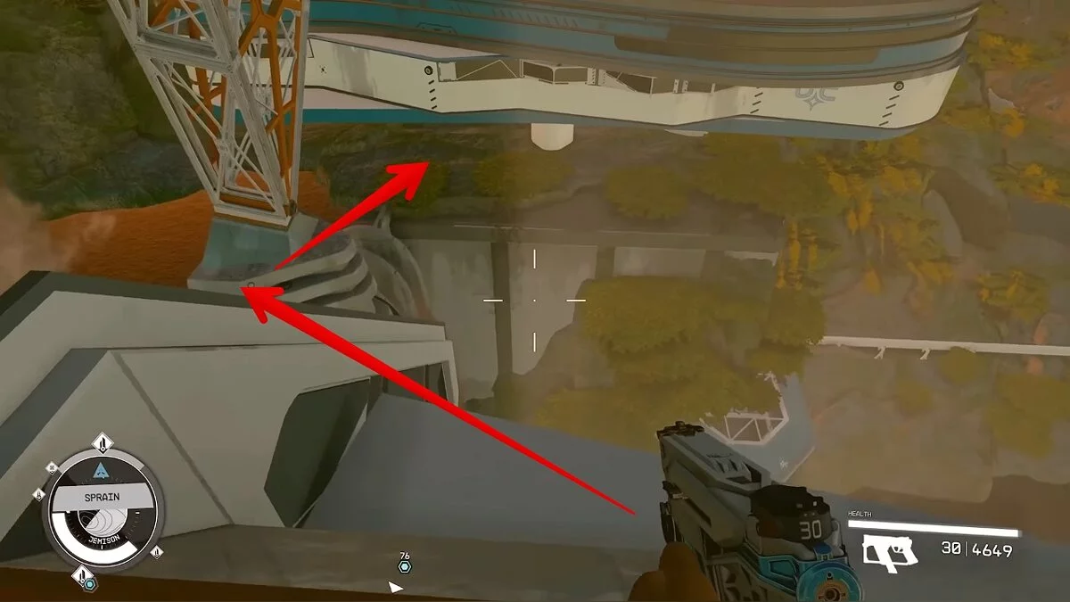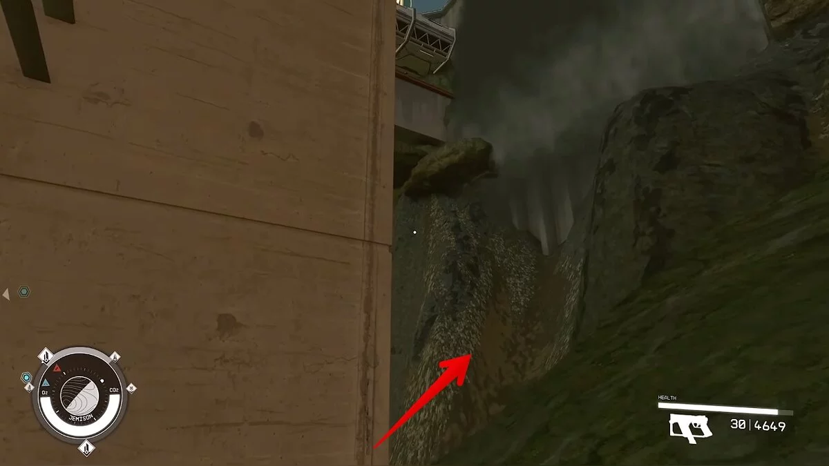 Двигайтесь направо до ближайшей ограды, а затем прыгайте вниз. Доберитесь до обрыва и спускайтесь к краю плотины. Чтобы избежать урона при падении, используйте реактивный ранец.
