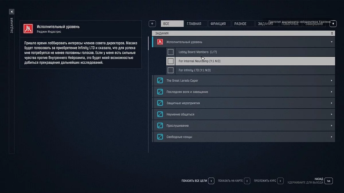 В финальном задании вам предстоит пообщаться со всеми членами совета Ryujin Industries. Нужно это для того, чтобы убедить их приобрести Infinity LTD и продолжить исследования Нейроампа либо наоборот. Масако будет голосовать за слияние двух компаний, а также за продолжение исследований.