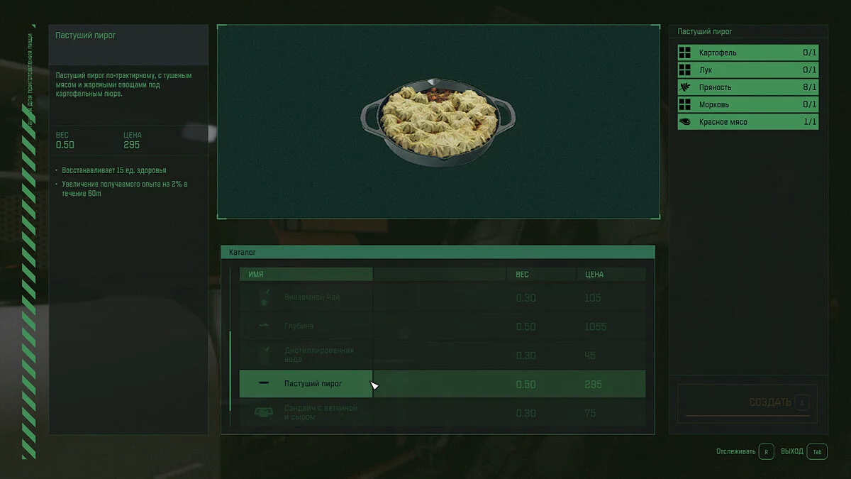 - Свойства — Открывает рецепт «Пастуший пирог»;