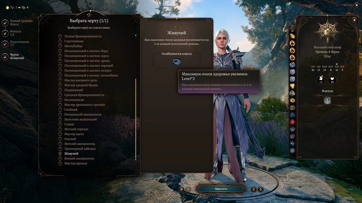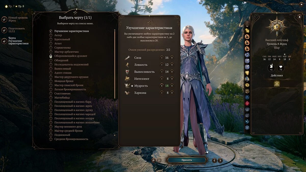 Из всех черт мы снова выбираем «Увеличение характеристик» и повышаем «Выносливость», чтобы поднять очки здоровья, но тут есть нюанс. В зависимости от того, к какому стилю игры вы пришли под конец игры (ближний бой, дальний, защита и т.д.), вы можете решить, что вам повысить. В случае, если вы хотите развить окончательно жреца как бойца, поднимайте «Силу» до 18. Если вам важно качество исцеления, то есть смысл поднять «Мудрость» до 20. Либо же словить определенный баланс и поднимать «Выносливость», поскольку HP никогда не бывают лишними.