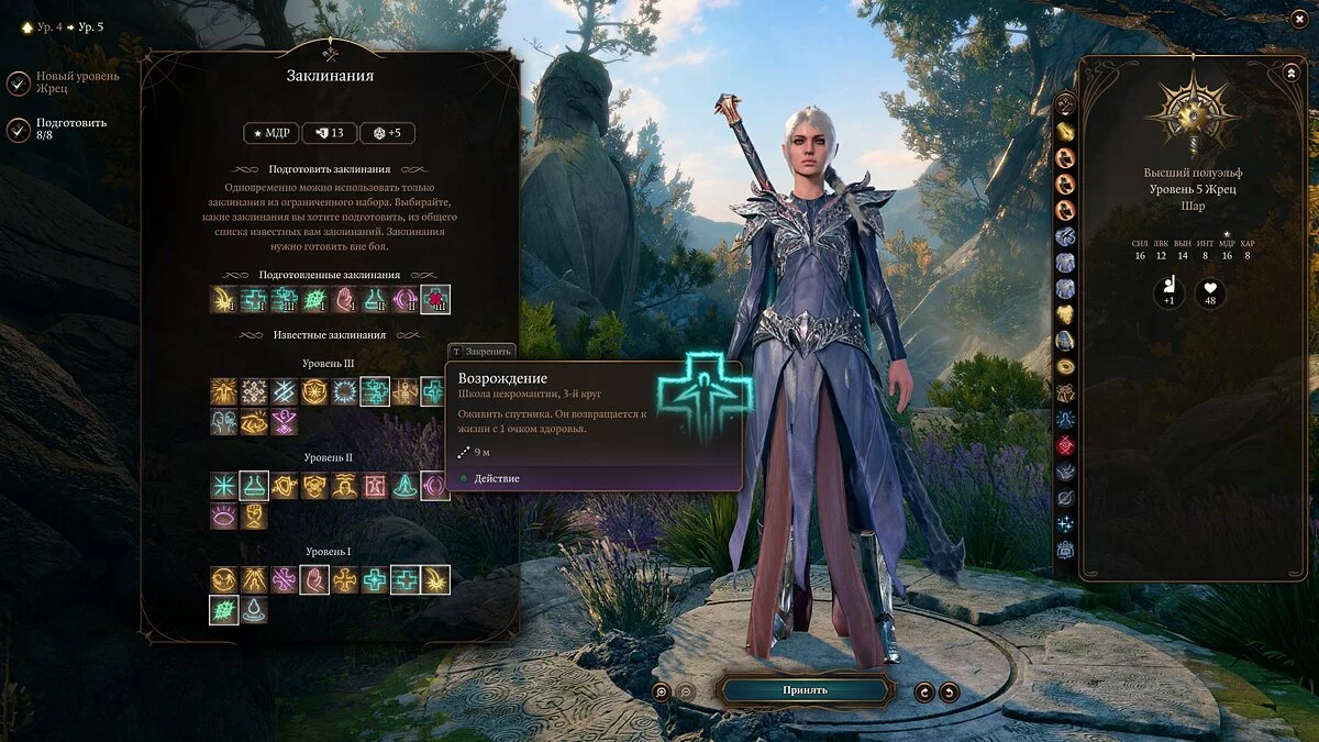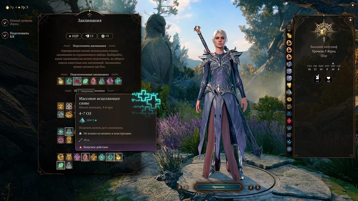 Меняем «Исцеление ран» на «Массовое исцеляющее слово» и добавляем «Возрождение». При наличии этих заклинаний можете забыть о существовании свитков исцеления — если, конечно, у вас достаточно ячеек заклинаний.