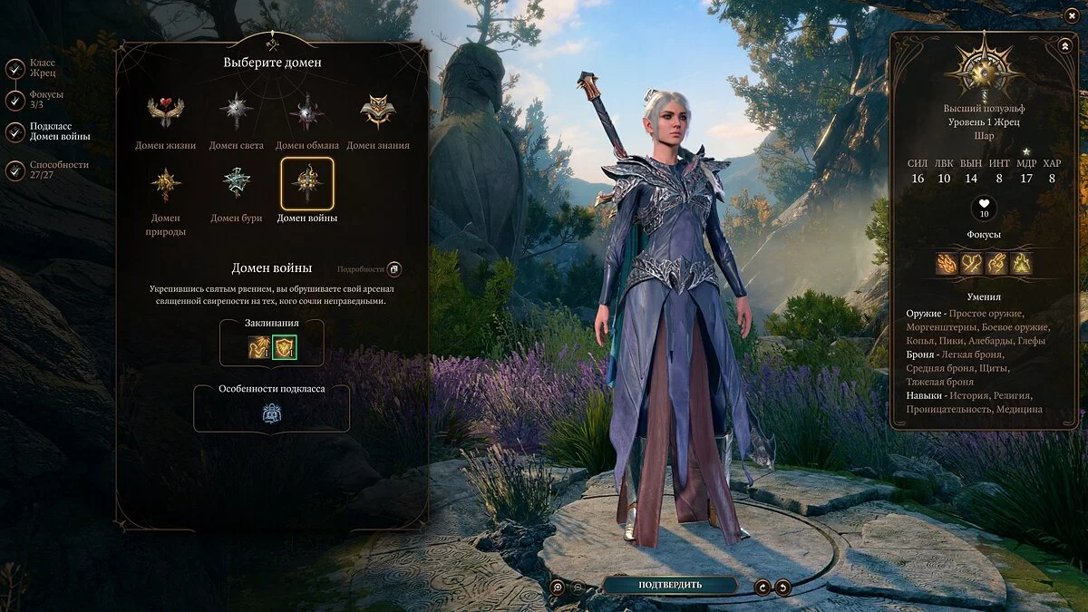 На первом уровне вам ещё дают выбор подкласса. Наш выбор — «Домен войны».
