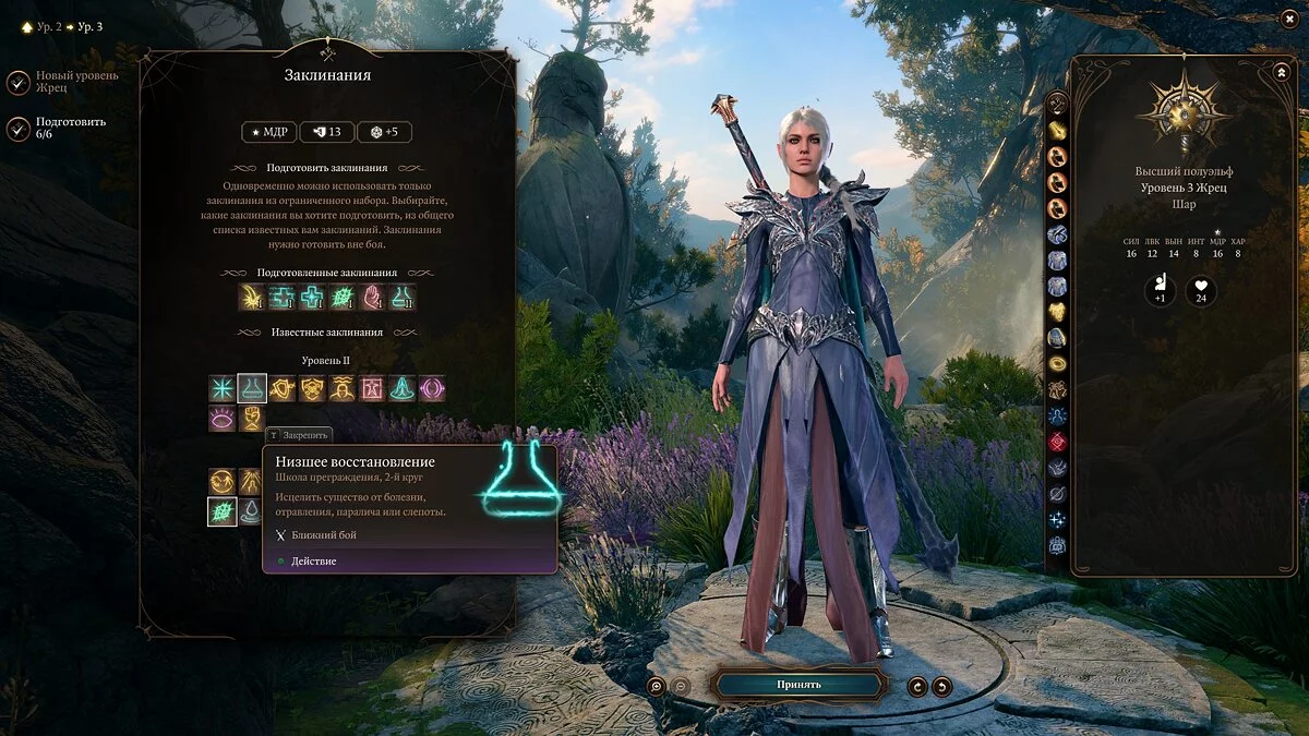 На третьем уровне добавляем ко всему «Низшее восстановление», потому что излечение болезней — вещь очень нужная, и не всегда у вас под рукой может быть необходимое зелье.
