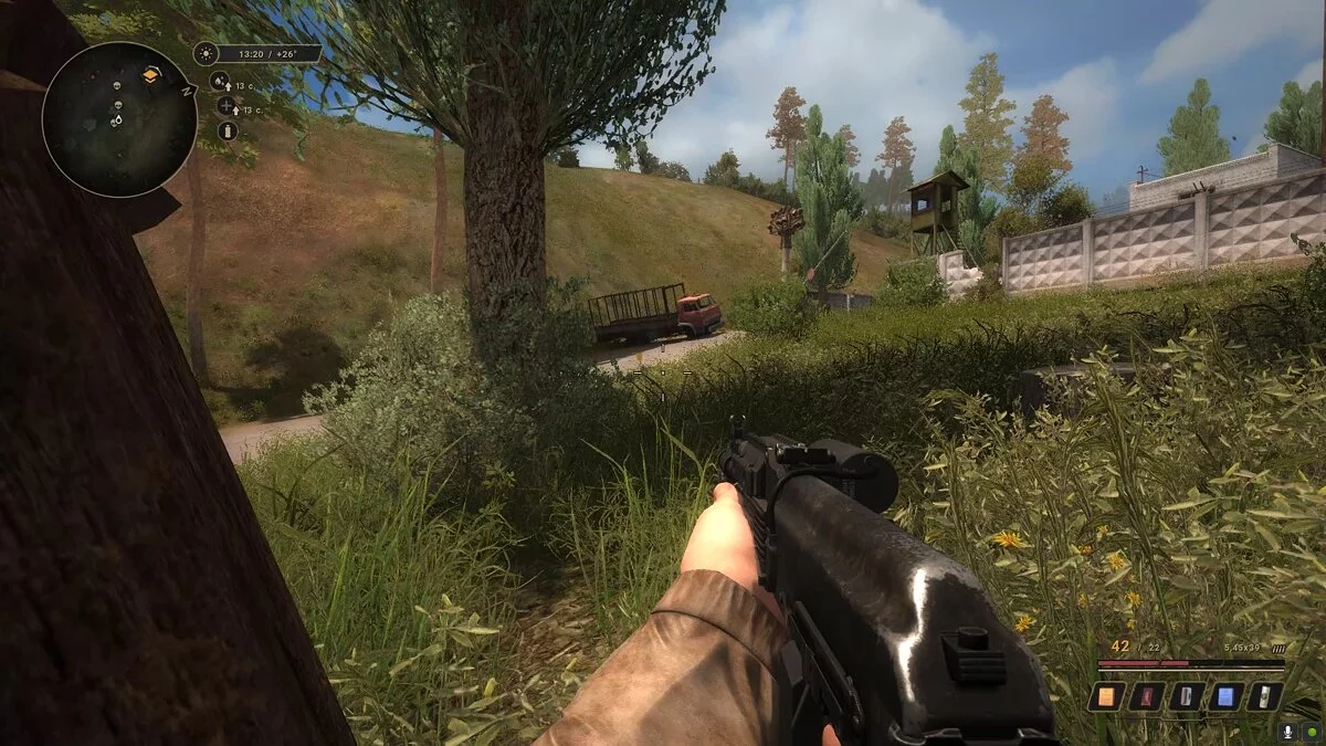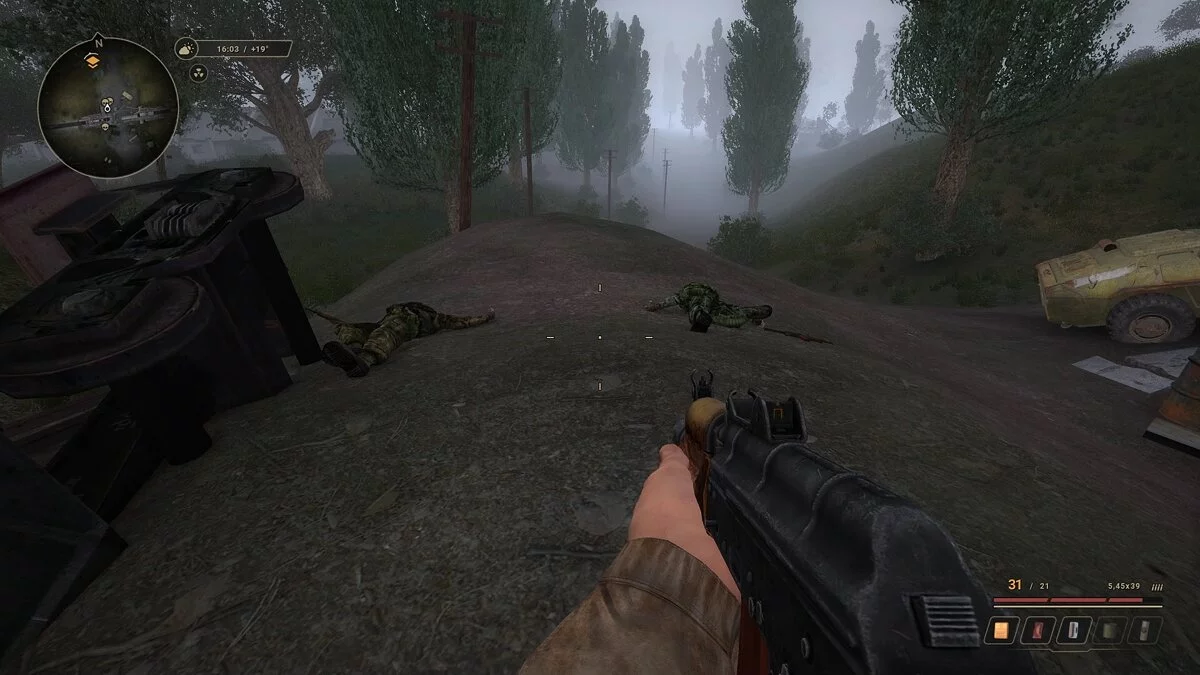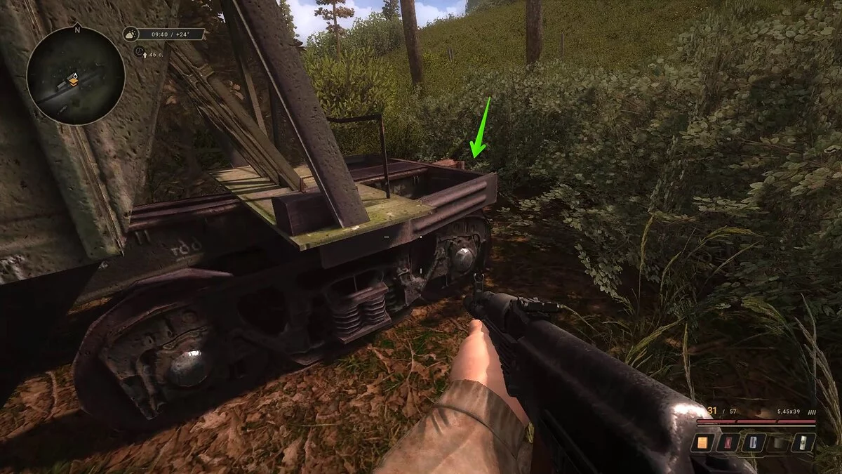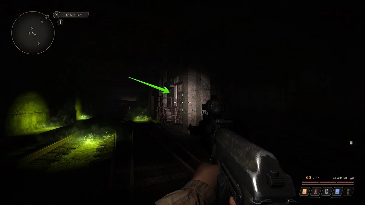 Последняя аномалия находится в другой части карты, так что вам придётся пройти либо через блокпост, либо через аномальный тоннель. Мы выбрали первый вариант и перебили всех военных — отличная возможность пополнить запасы патронов для калаша и заработать немного денег. Однако вы также вправе перебраться через железнодорожные пути справа от форпоста (в заборе есть дыра).