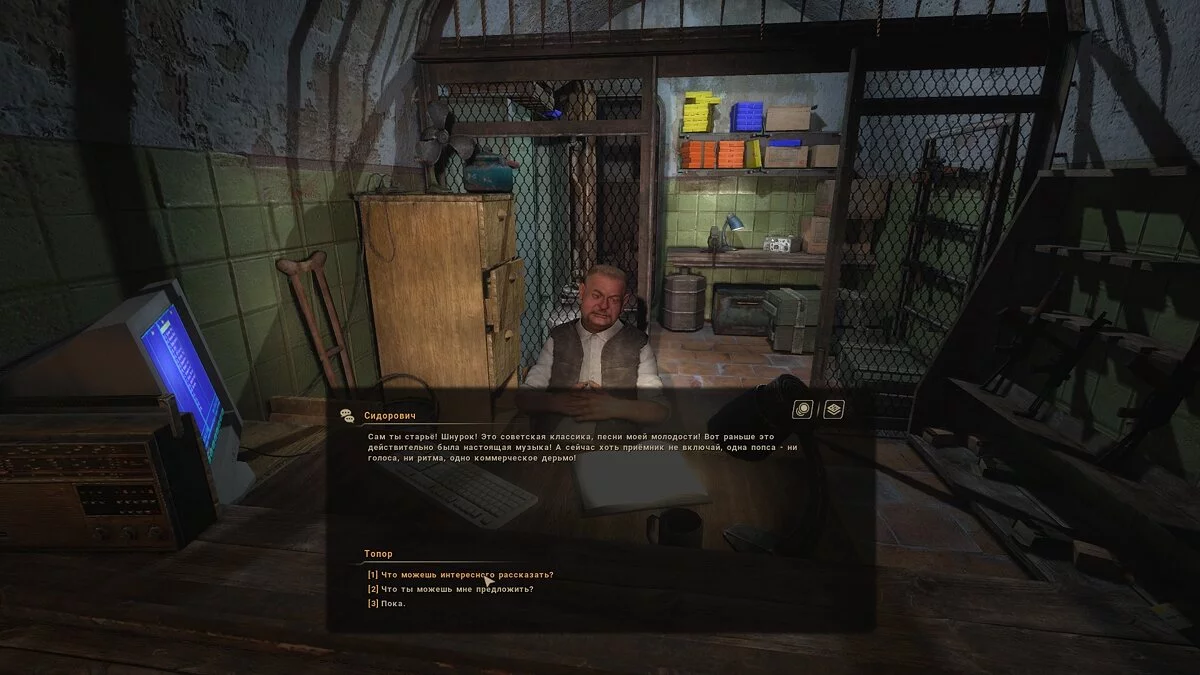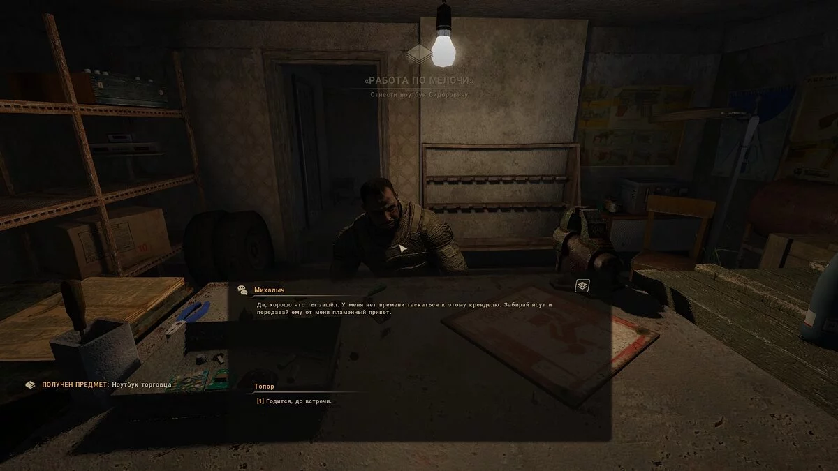 Спросите у Сидоровича про ноутбук. Он попросит заглянуть к Михалычу, чтобы забрать устройство. Михалыч сидит в доме неподалёку. За этот несложный квест вы получите 300 рублей и некоторые другие предметы.