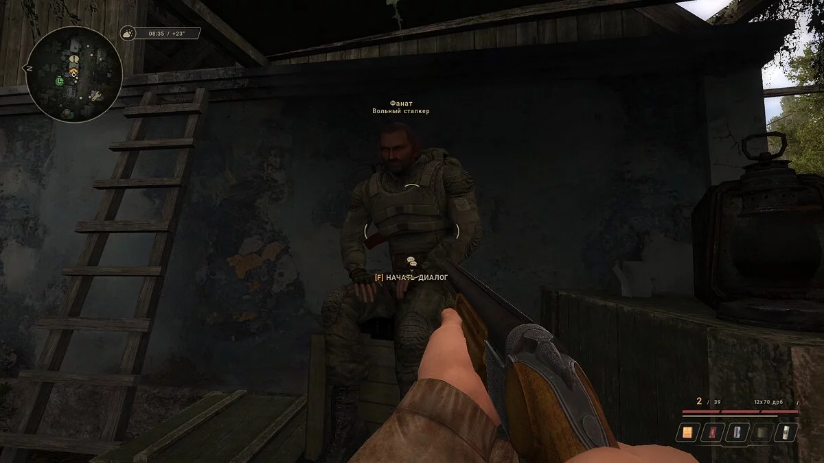 После беседы с Сидоровичем вернитесь в деревню и найдите сталкера по кличке Фанат. Он даст ещё одно задание — нужно раздобыть динамит, спрятанный Волком неподалёку от АТП, после чего взорвать логово собак.