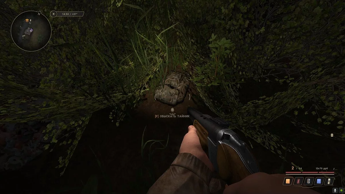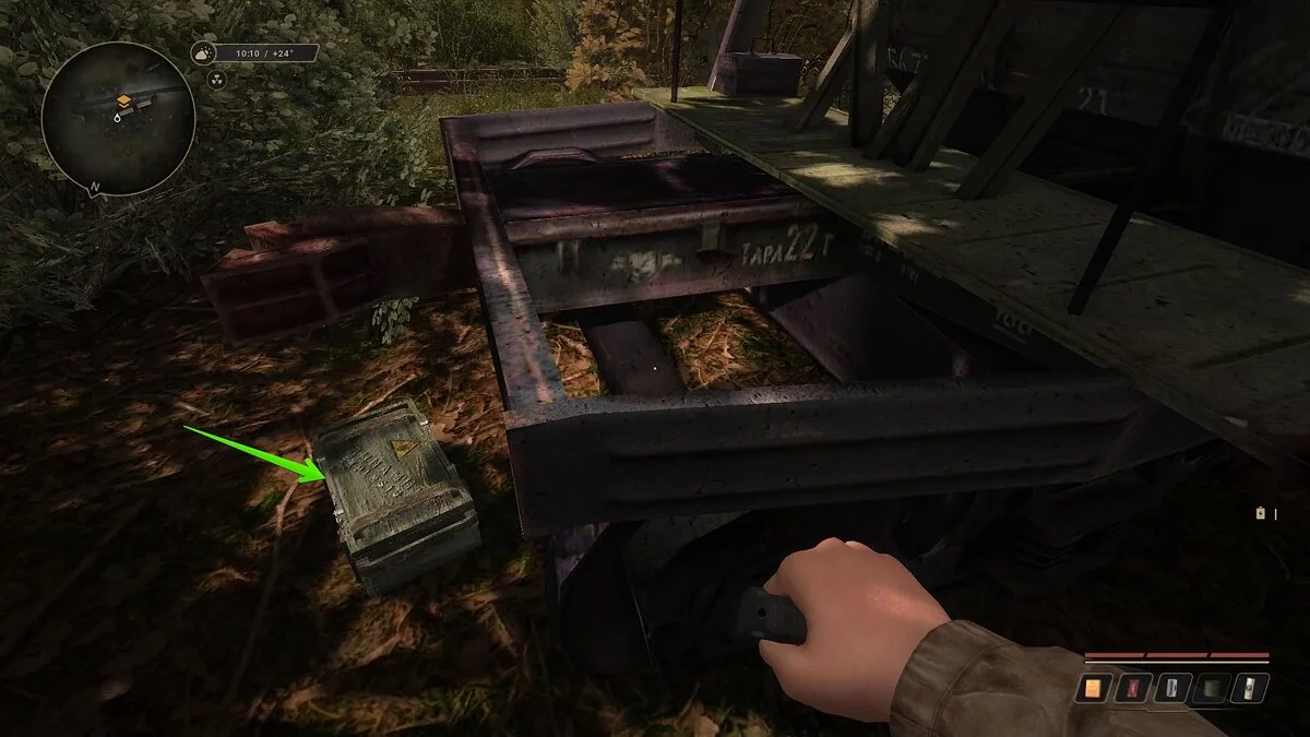 Выходите из бункера Сидоровича и бегите налево к одиноко стоящему зданию. Поднимитесь по лестнице и в дальнем углу заберите заначку главного героя. Так вы получите детектор, при помощи которого сможете подобрать первый артефакт в активном квесте.