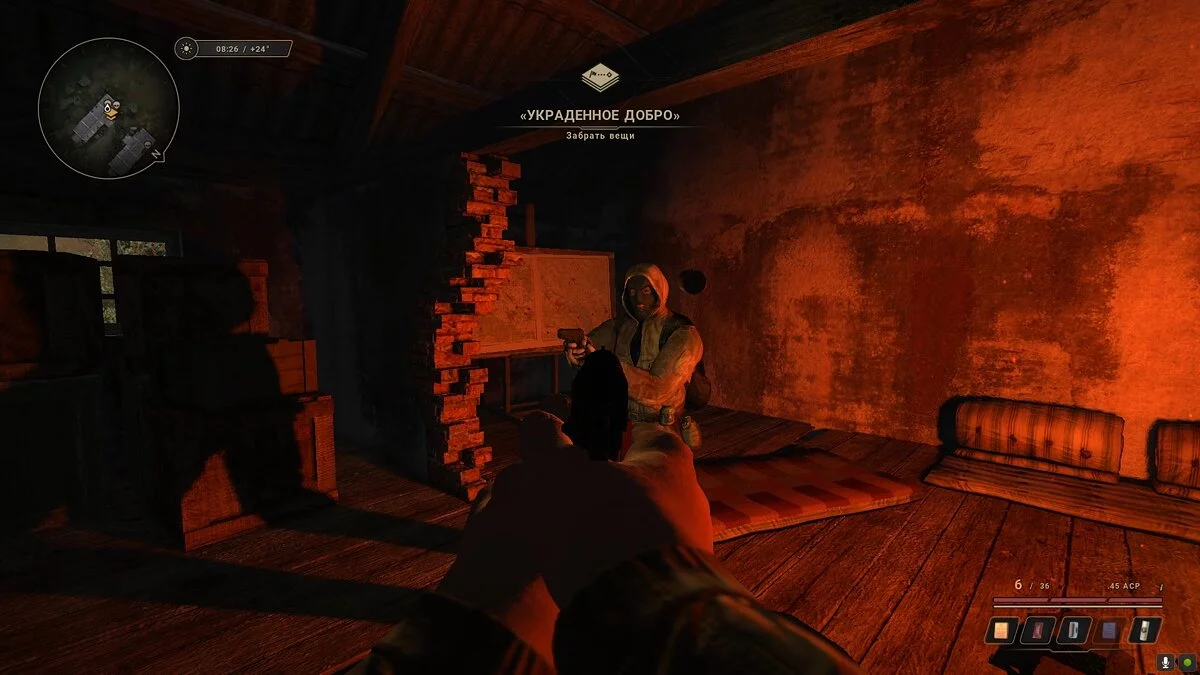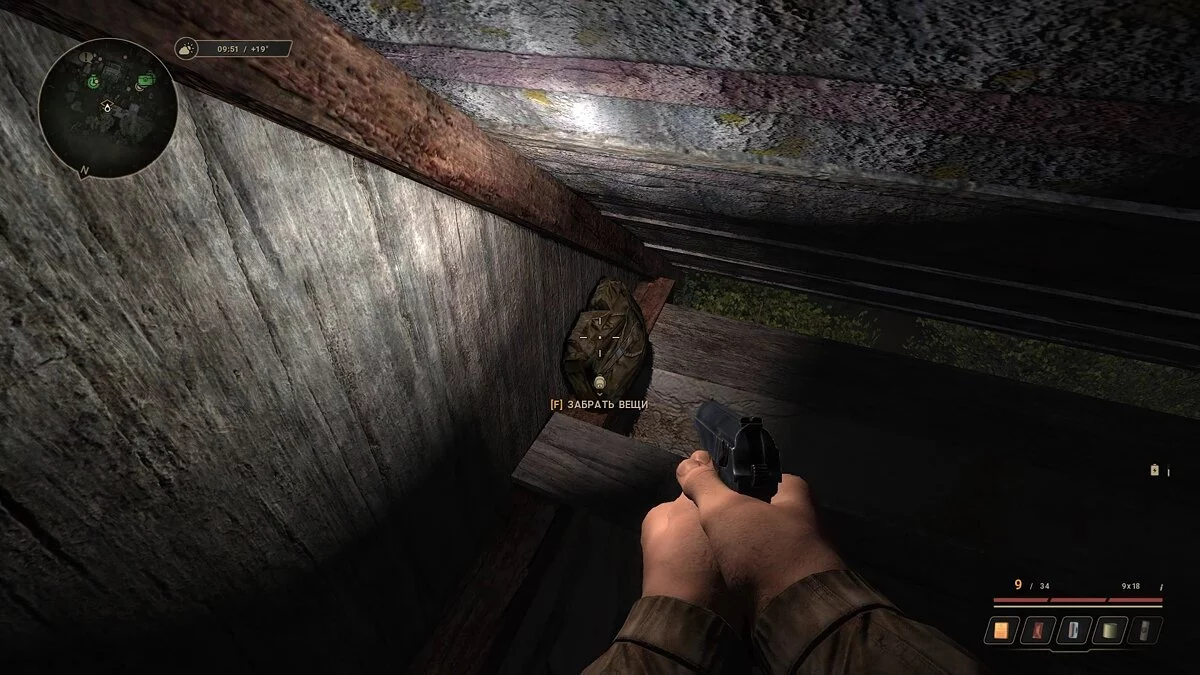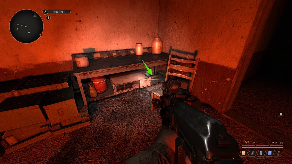 Сталкеры засели в ближайшем здании, однако никакого сопротивления оказывать не будут. Вы вправе убить их и осмотреть трупы (в карманах одного из них можно найти координаты тайника). Не забудьте забрать свои вещи в небольшом ящике у окна.