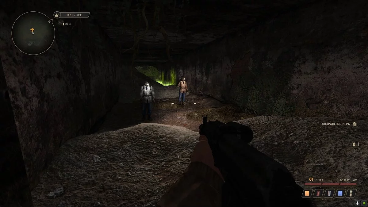 Убивать всех необязательно, так как вскоре начнётся выброс. Расстреляйте одного монстра и проследуйте за сталкерами к тоннелю. Здесь также избавьтесь от нескольких мутантов и смотрите катсцену на движке. Когда вернётесь в деревню, получите 7000 рублей и научную аптечку.