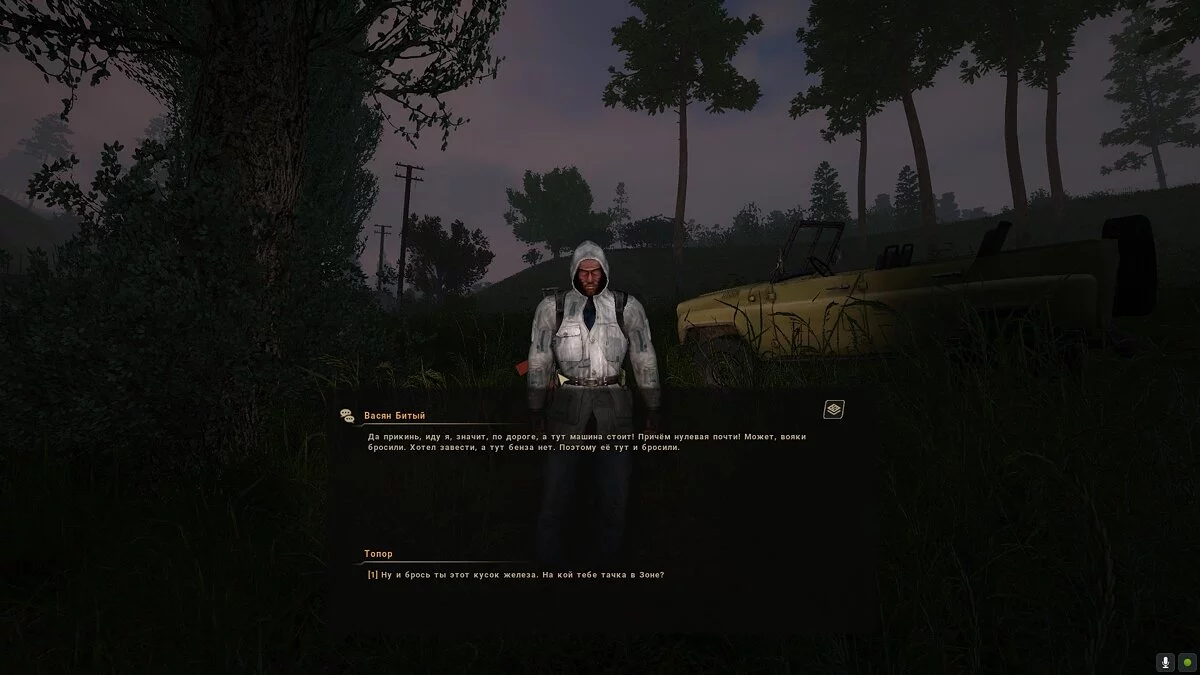 В качестве награды вы получите 900 рублей и сломанную «Ксюшу» с обвесами. Согласитесь переместиться со сталкерами в деревню, чтобы сразу же посетить техника и выполнить ещё одно сюжетное задание.