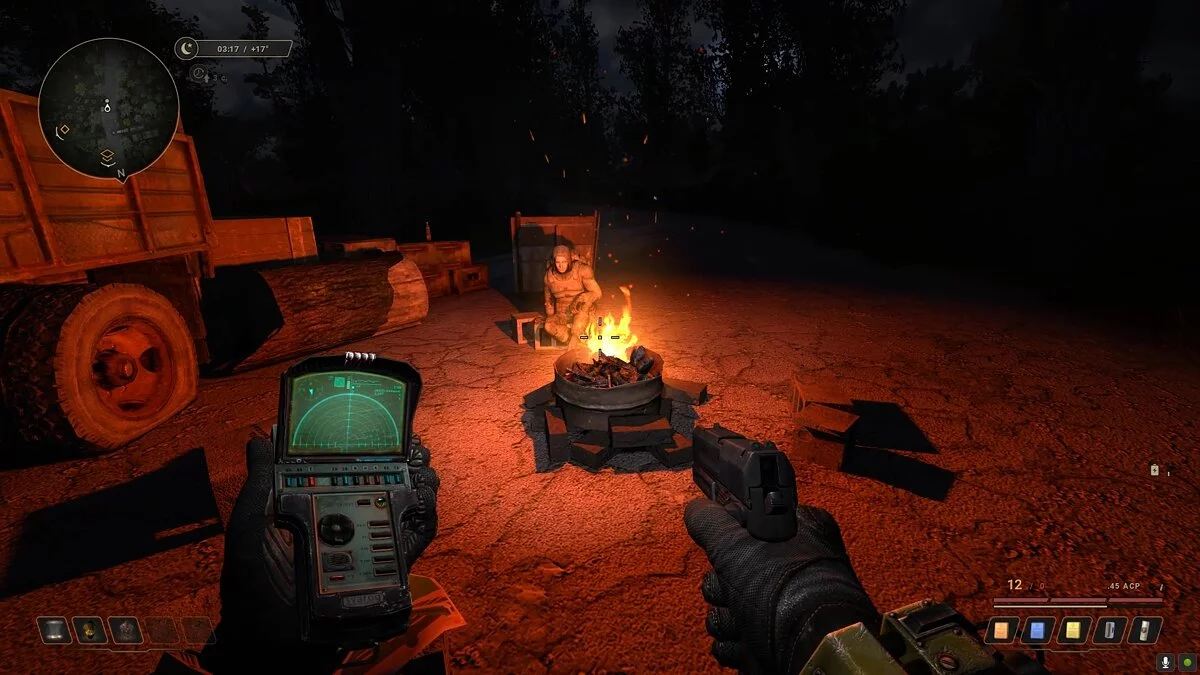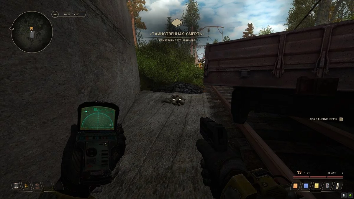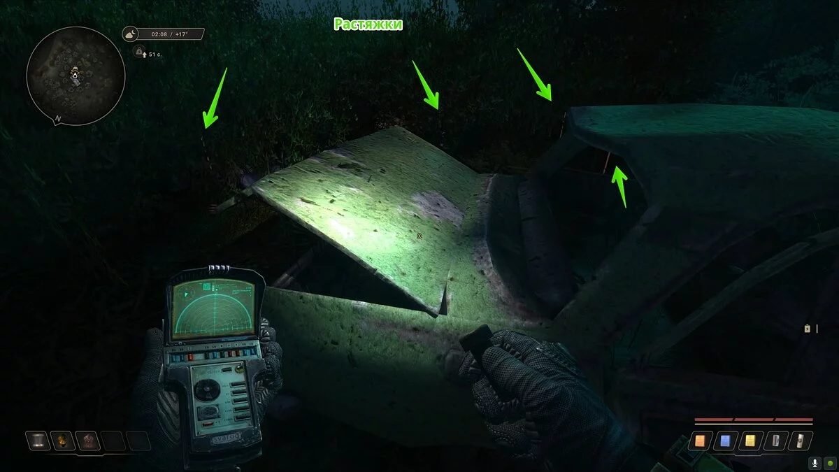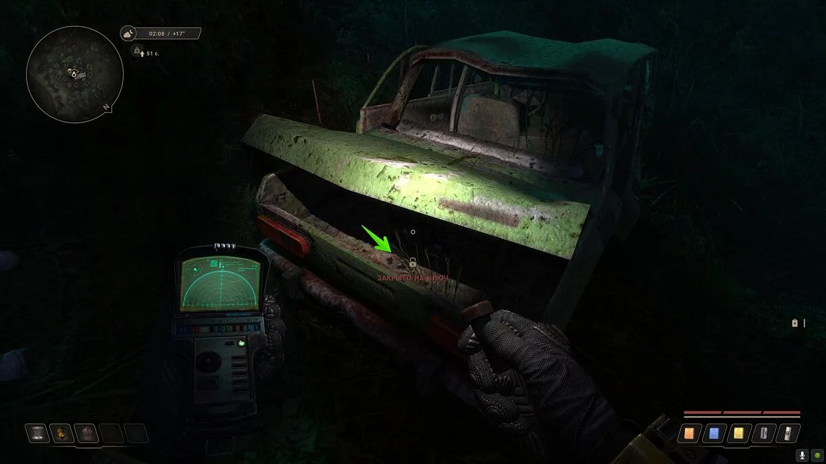 Добравшись до вагончика и автомобиля, не спешите подходить к багажнику. Здесь два трупа и несколько растяжек. Если нарвётесь на гранаты, то, скорее всего, погибнете. Сейф в багажнике заперт на ключ, однако он лежит рядом. Заберите компас и записку, затем проследуйте за существом до ближайшей аномалии.