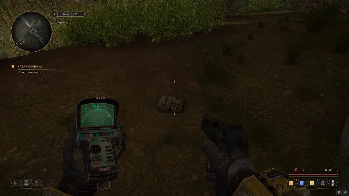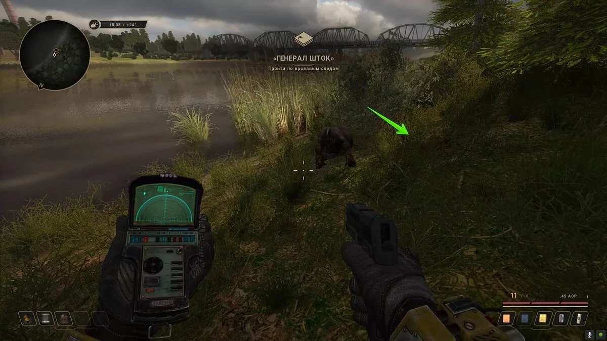 После беседы с последним персонажем не спешите возвращаться к Юстасу. Вместо этого отправляйтесь к мосту по координатам тайника Коршуна. Вещи лежат на берегу прямо под мостом. Так вы найдёте несколько артефактов, АК и другие припасы.