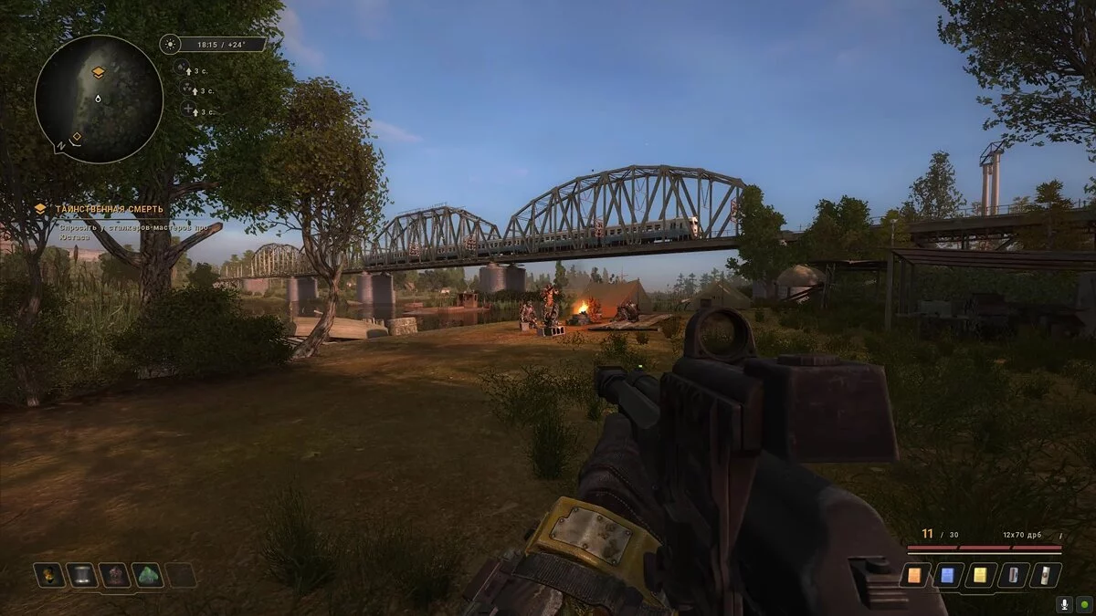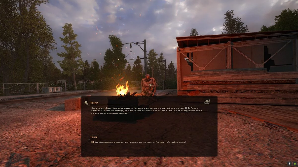 Когда вернётесь к старосте, увидите неприятную картину. Прочтите предсмертную записку и обсудите дальнейшие действия с другими сталкерами. Затем снова вернитесь к мосту — перед ним есть небольшой лагерь с палатками.