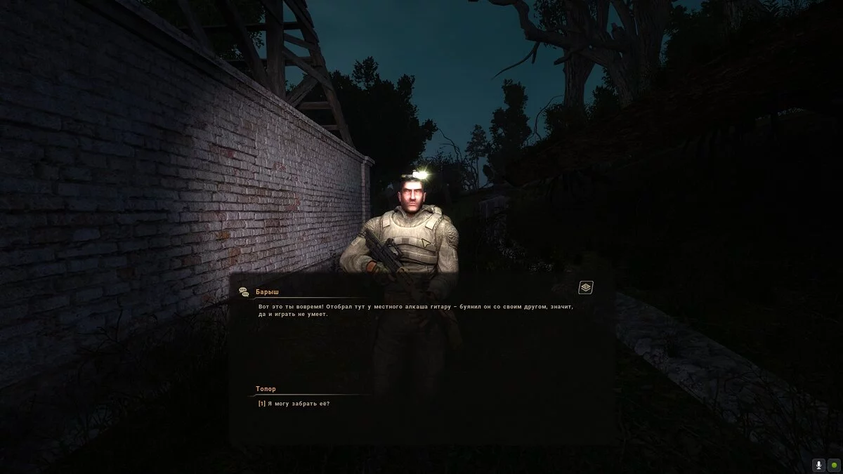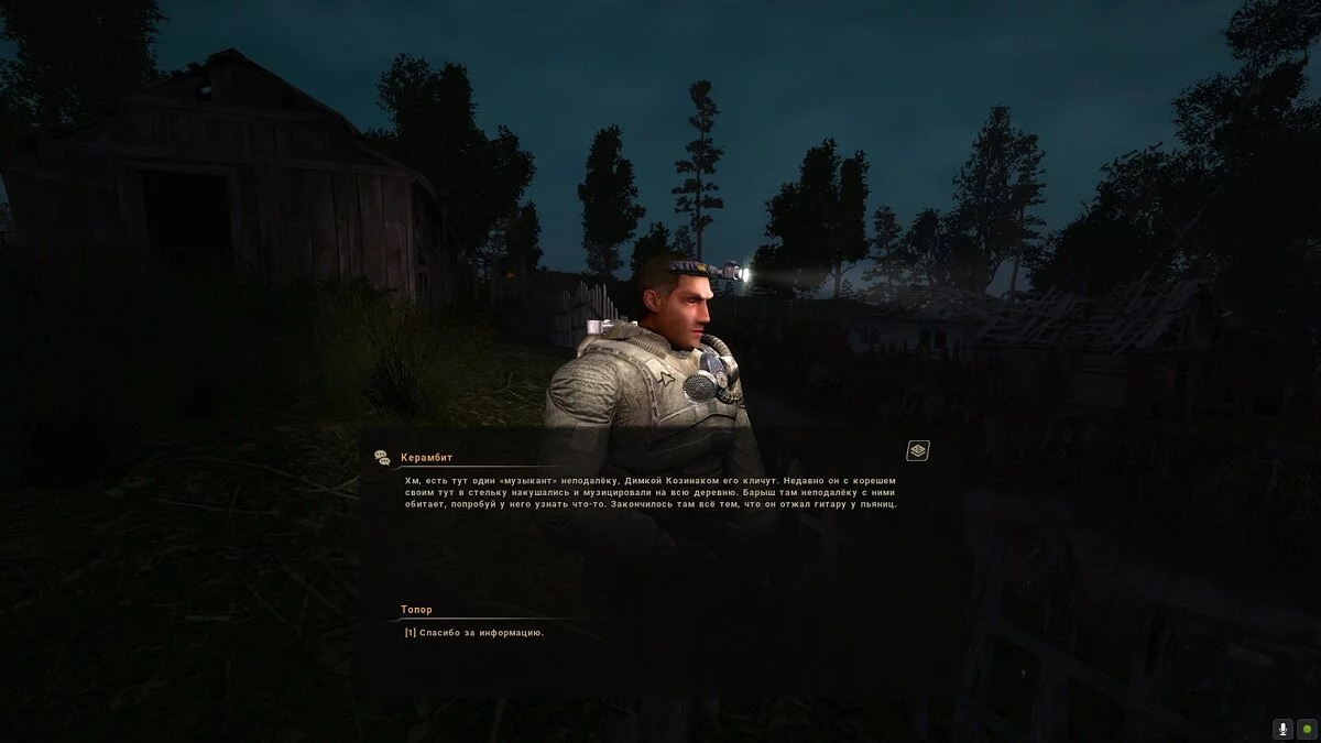 Добравшись до деревни, побеседуйте со сталкером по кличке Керамбит (стоит неподалёку от места размещения последнего сканера). Этот герой и запретит Топору устанавливать сканер, так что бегите к нему и спросите на счёт гитары. Он скажет, что нужно поспрашивать в селе.