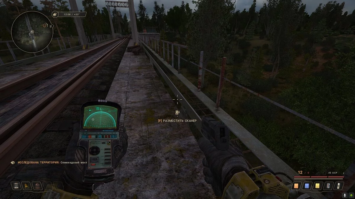 По пути ко второй метке можете выполнить побочный квест «Отряд Свободы. Нефтебаза», а также взять дополнительное задание «Музыкант из Новошепеличей». Бегите по путям на восток. Рядом с Перевалом у моста будет аномалия с артефактом. Заберитесь на мост и разместите второй сканер.