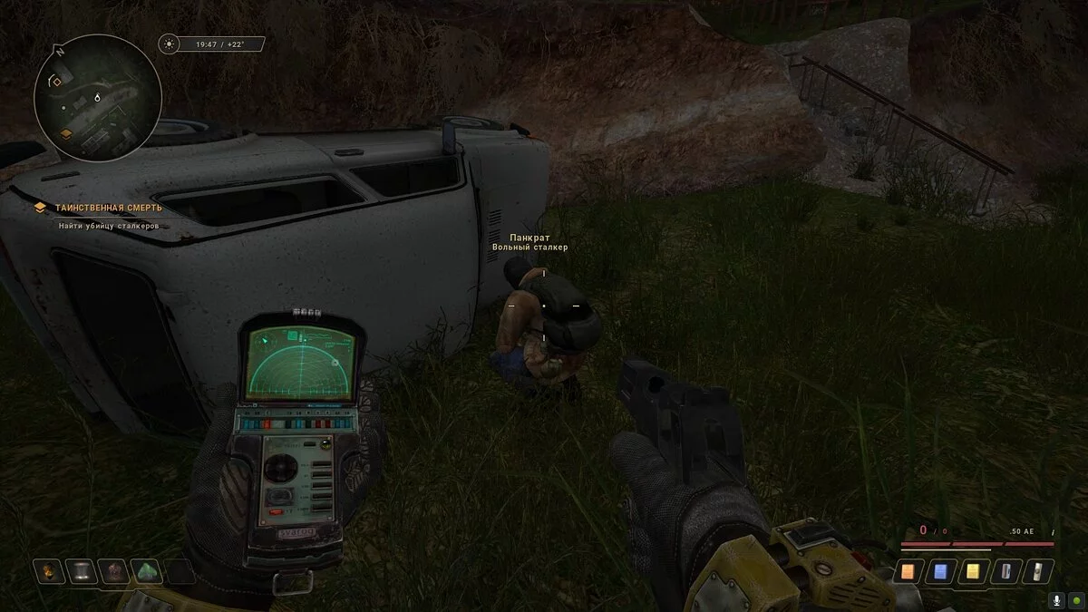Учитывая полученную информацию, убийцей может оказаться Панкрат — сталкер, который пытается починить автомобиль в деревне. Взаимодействуйте с ним, чтобы выманить на берег реки.
