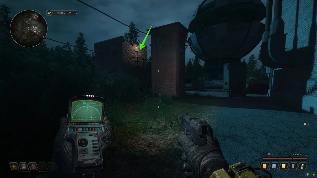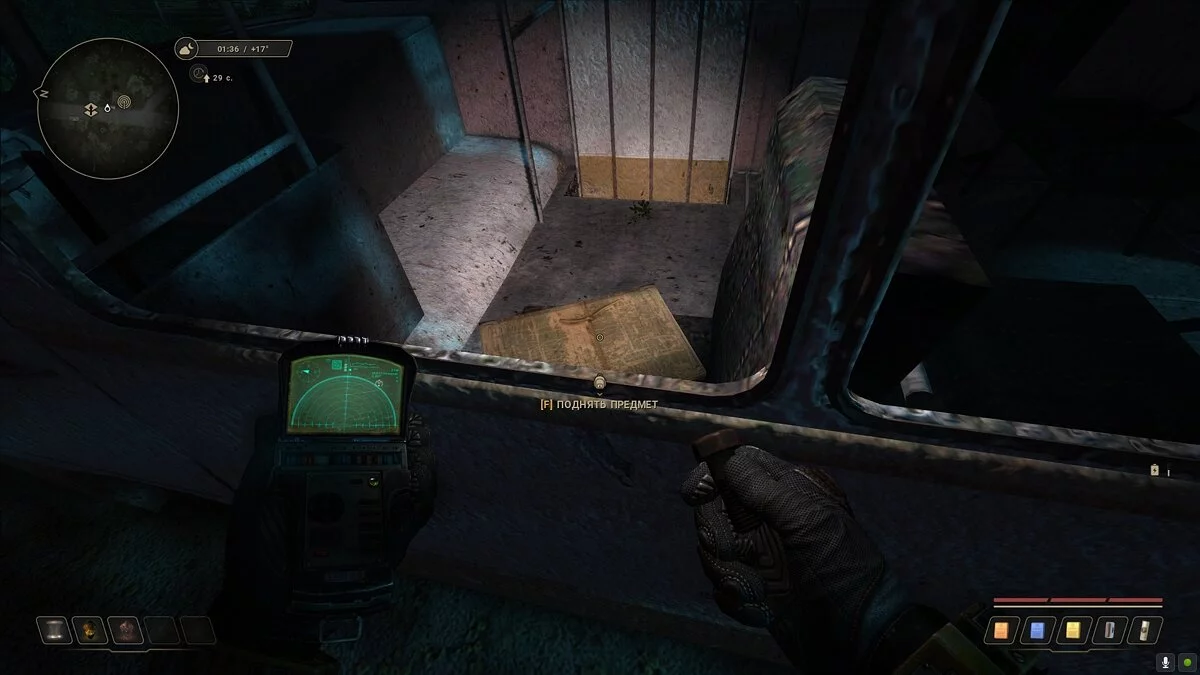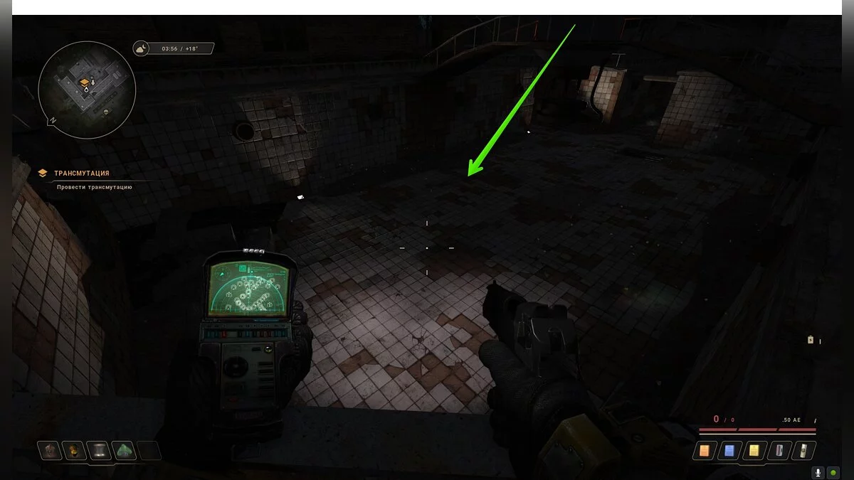 Положите артефакты и дождитесь, пока трансмутация завершится. Выбраться из бассейна можно при помощи лестницы на противоположной стороне. Если ранее вы подбирали детектор «Сварог», то сможете отследить наличие аномалий в этой зоне. Как только окажетесь наверху, начнётся новое задание.