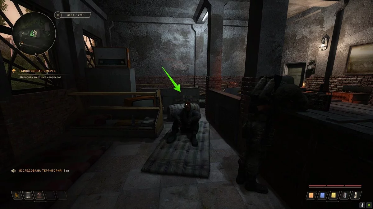 Покажите записку Юстасу, затем бегите в бар. Здесь нужно поговорить со сталкером по кличке Кутёк — он расскажет некоторую информацию о погибшем. Помимо этого, также найдите Керамбита (стоит в верхней части деревни). Мужчина даст наводку на сталкера Зармута.