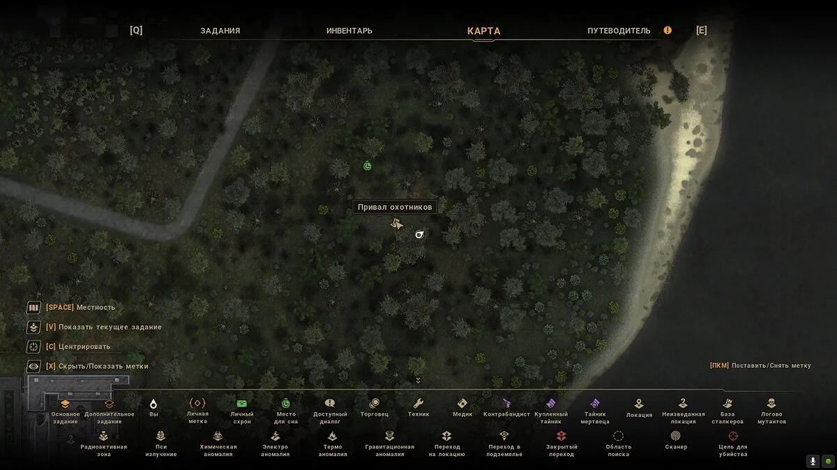 От предыдущей точки следуйте на запад через болотце. Там же сможете отыскать несколько артефактов, однако между болотом и привалом есть поляна кровососов. Рекомендуем обойти её вдоль берега. Только вот охотники не дадут установить сканер — придётся познакомиться с ними поближе. Так начнётся квест «Охота». Выполнив задание охотников, сможете разместить сканер на отметке.