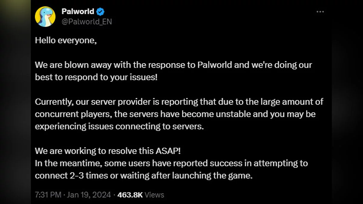 Это сообщение появляется из-за проблем с серверами Palworld, поскольку наплыв игроков слишком большой. Даже разработчики отметили, что удивлены таким количеством геймеров. Они советуют подождать немного или попробовать подключиться несколько раз подряд. На одиночную игру это не влияет — если отключить кооперативный режим, то можно без проблем сразу начать игровую сессию. Вы в любой момент можете переключить режим игры и позже пригласить друзей в свой мир.