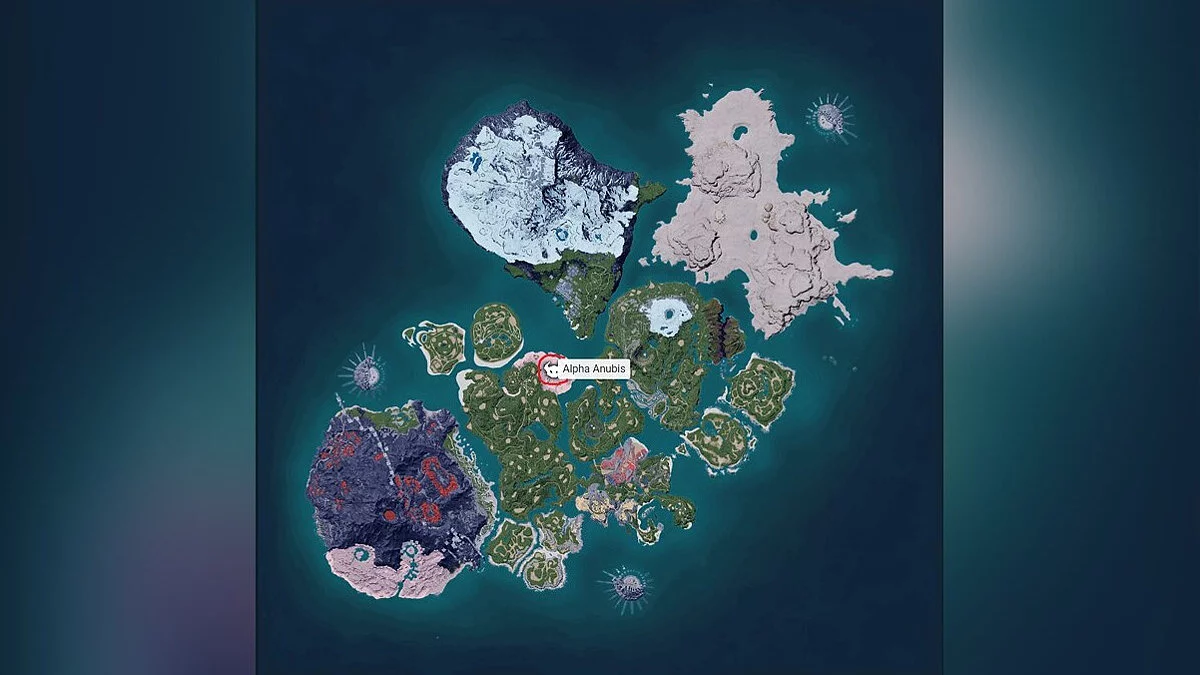 Встретить Анубиса в открытом мире можно только в форме альфа-пала 47 уровня. Находится он в Сумеречных песках возле огромной статуи с собственным изображением. Успешная поимка принесёт вам сильного боевого компаньона с навыком «Ручная работа» 4 уровня, который является самым высоким на данный момент.