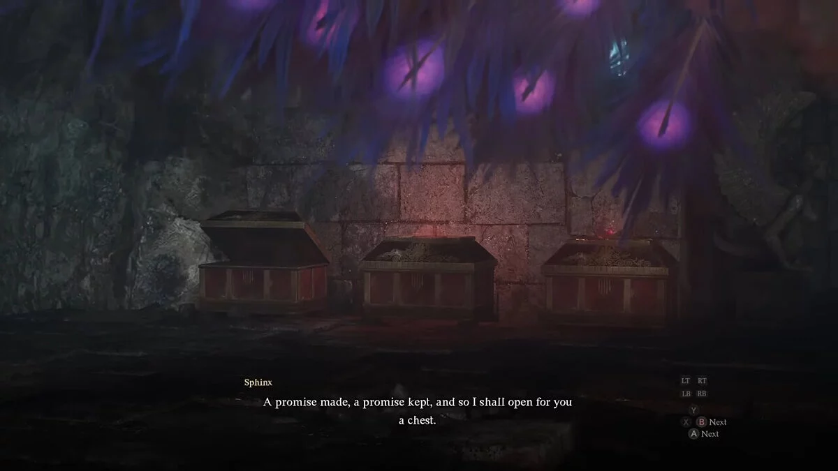 После открытия первого сундука поговорите со Сфинксом, чтобы выбрать следующее задание.