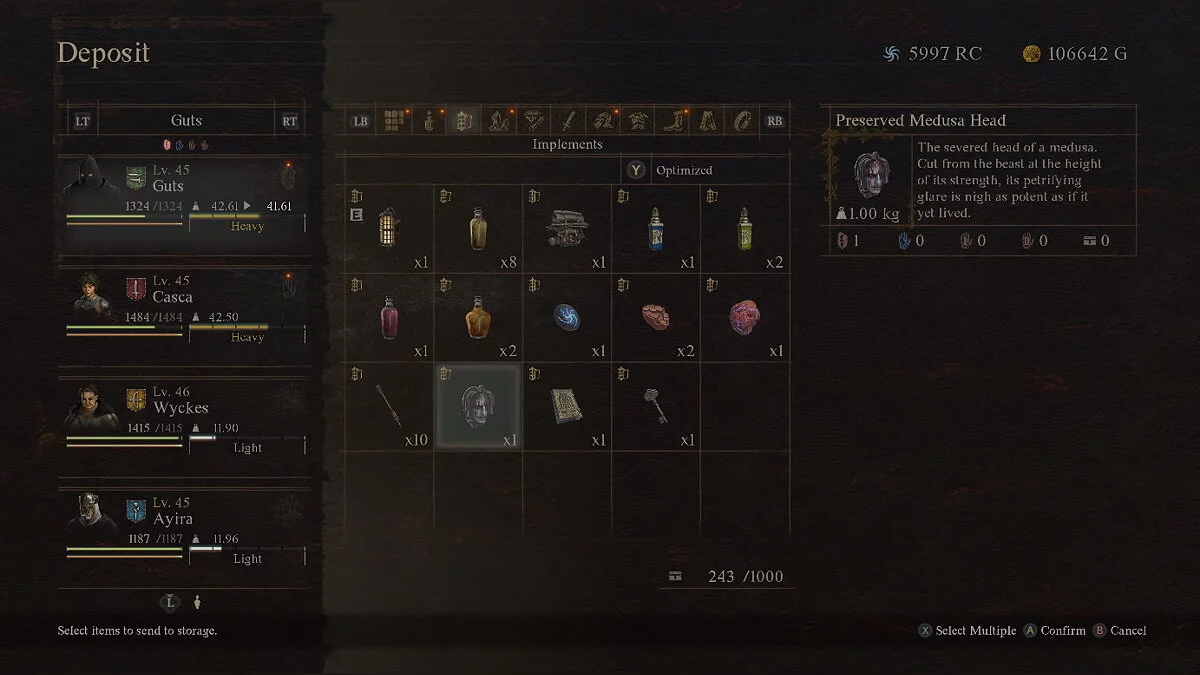 Чтобы получить с тела Медузы её голову, недостаточно просто убить монстра. Нужно нанести мощный удар по шее, когда у Горгоны почти полная шкала здоровья. Вам потребуется воин с тяжёлым двуручным мечом или вор с кинжалом. Желательно усилить клинок электричеством при помощи магии. Во время сражения пригодится Размягчающий эликсир, который снимает эффект окаменения и Противоядие для борьбы с токсинами. Ещё можете взять с собой Экстракт стабильности, чтобы не подхватить недуг. Если у вас есть Кольцо подвижности — экипируйте его. Оно делает вас неуязвимым к превращению в камень.