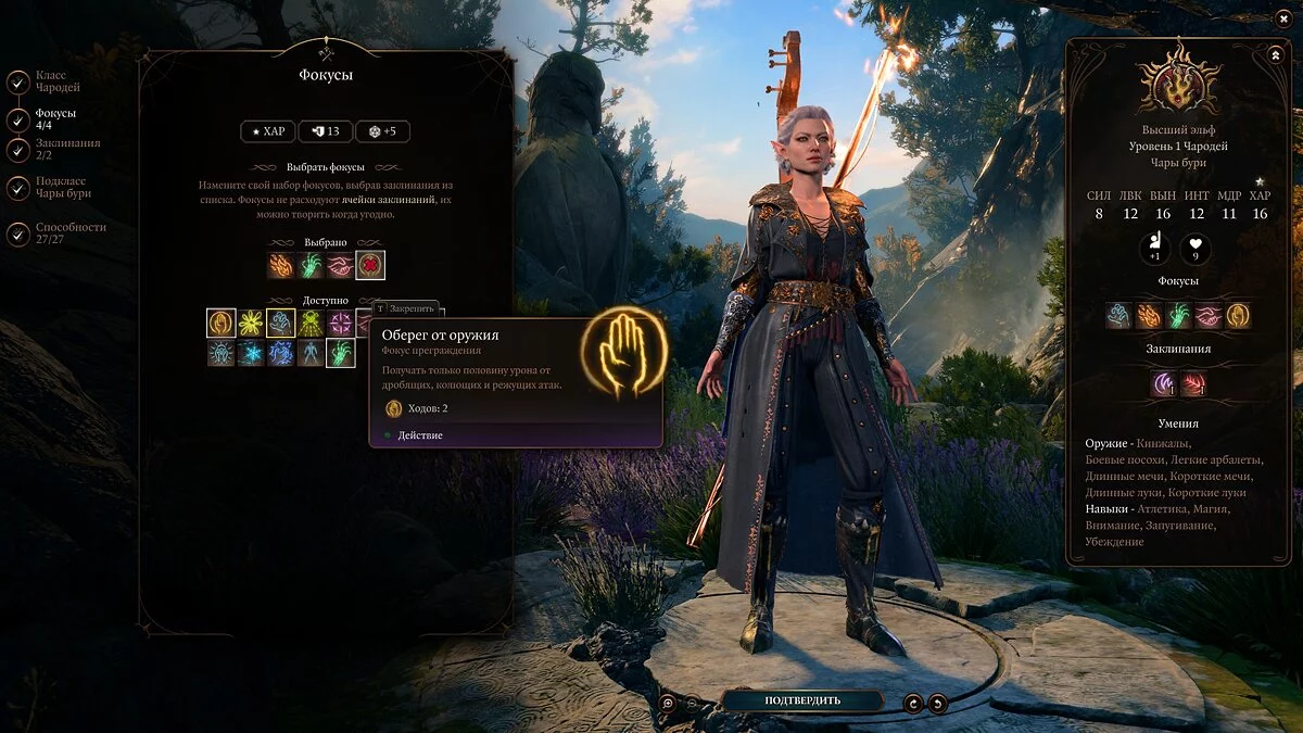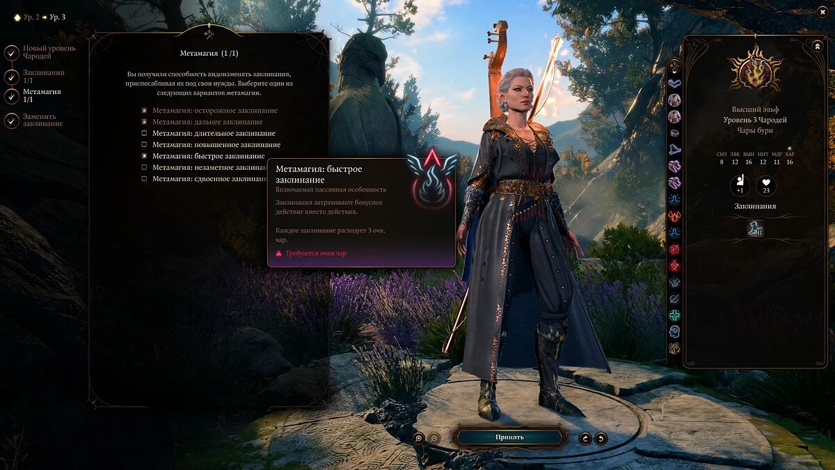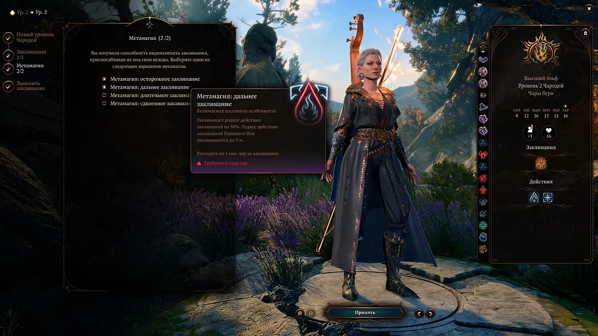 Стоит отметить, что геймплей за чародея не так уж сильно отличается от игры за любого из кастеров. У него есть, помимо ячеек заклинаний, так называемые «‎Очки чародейства», от которых зависит ваша возможность применять способности метамагии, но на этом сложности заканчиваются. Основная характеристика чародея — это «‎Харизма», от неё зависит урон от ваших заклинаний. Затем мы советуем прокачать «‎Телосложение», поскольку от этого зависят ваши HP и спасбросок.