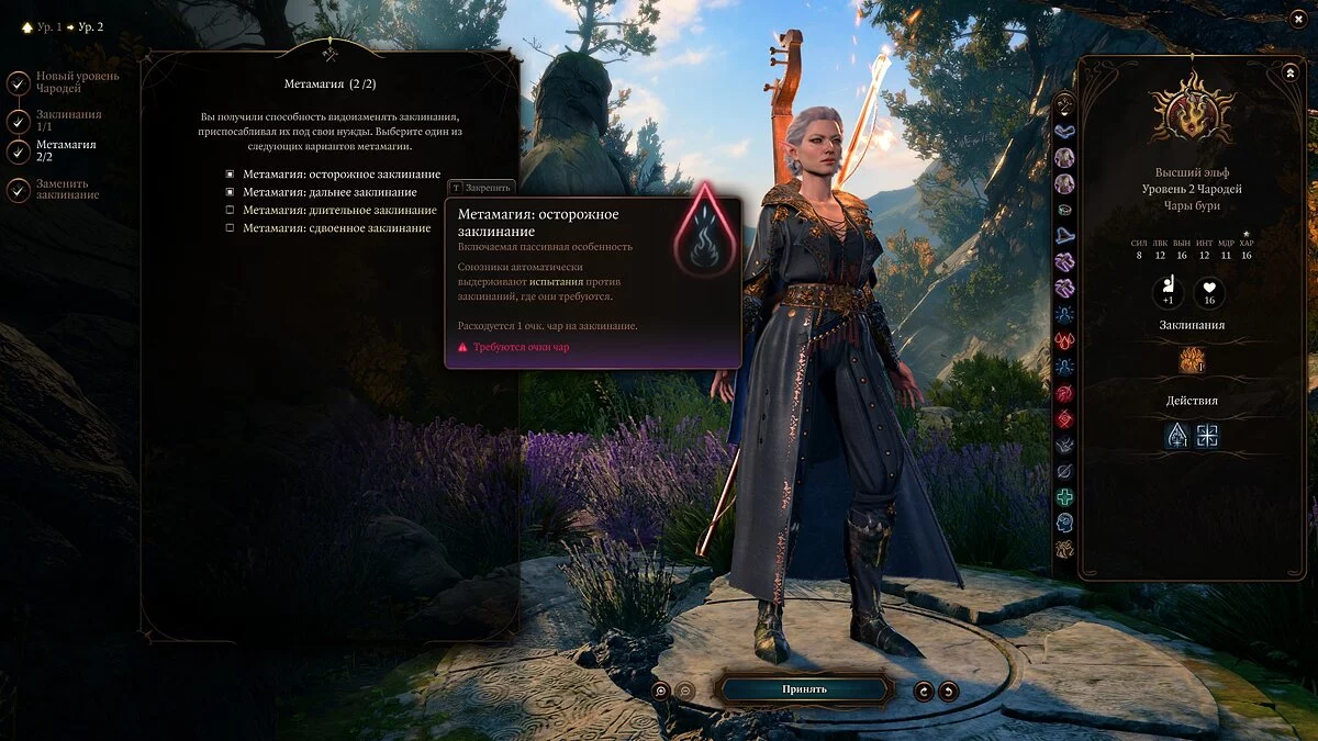 С метамагией тоже все достаточно просто: останавливаемся на «Осторожном заклинании» (чтобы случайно теми же «‎Пылающими руками» не задеть союзника), «‎Дальнем заклинании», увеличивающим дальность любого спелла соответственно и «Быстром заклинании», чтобы кастовать бонусным действием. Выбирать можно в любом порядке.