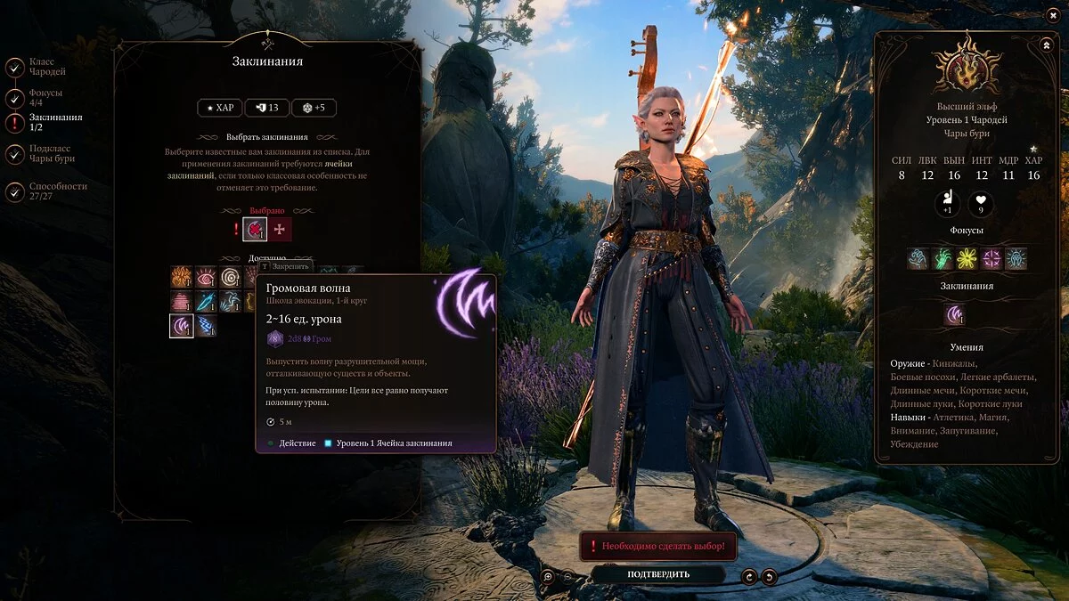 Хороший выбор для заклинаний на первом уровне — это «‎Громовая волна» и «Волшебная стрела». Первое для вашего подкласса бесценно, потому что потом вы получите способность наносить дополнительный урон при помощи заклинаний молний и грома, а второй спелл всегда со 100% вероятностью попадает в противника.